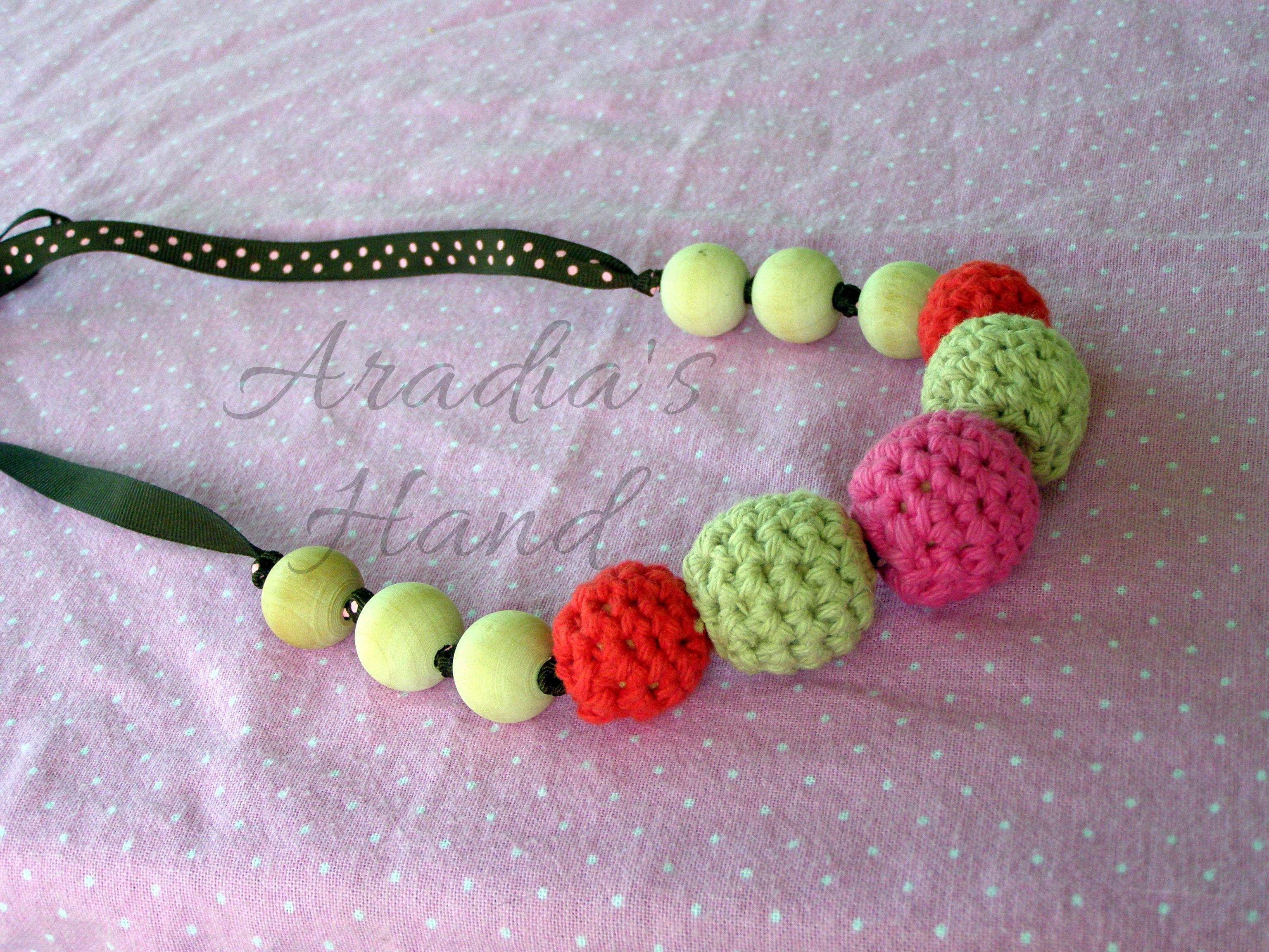 Made with cotton yarn, polyester ribbon, and wooden beads.