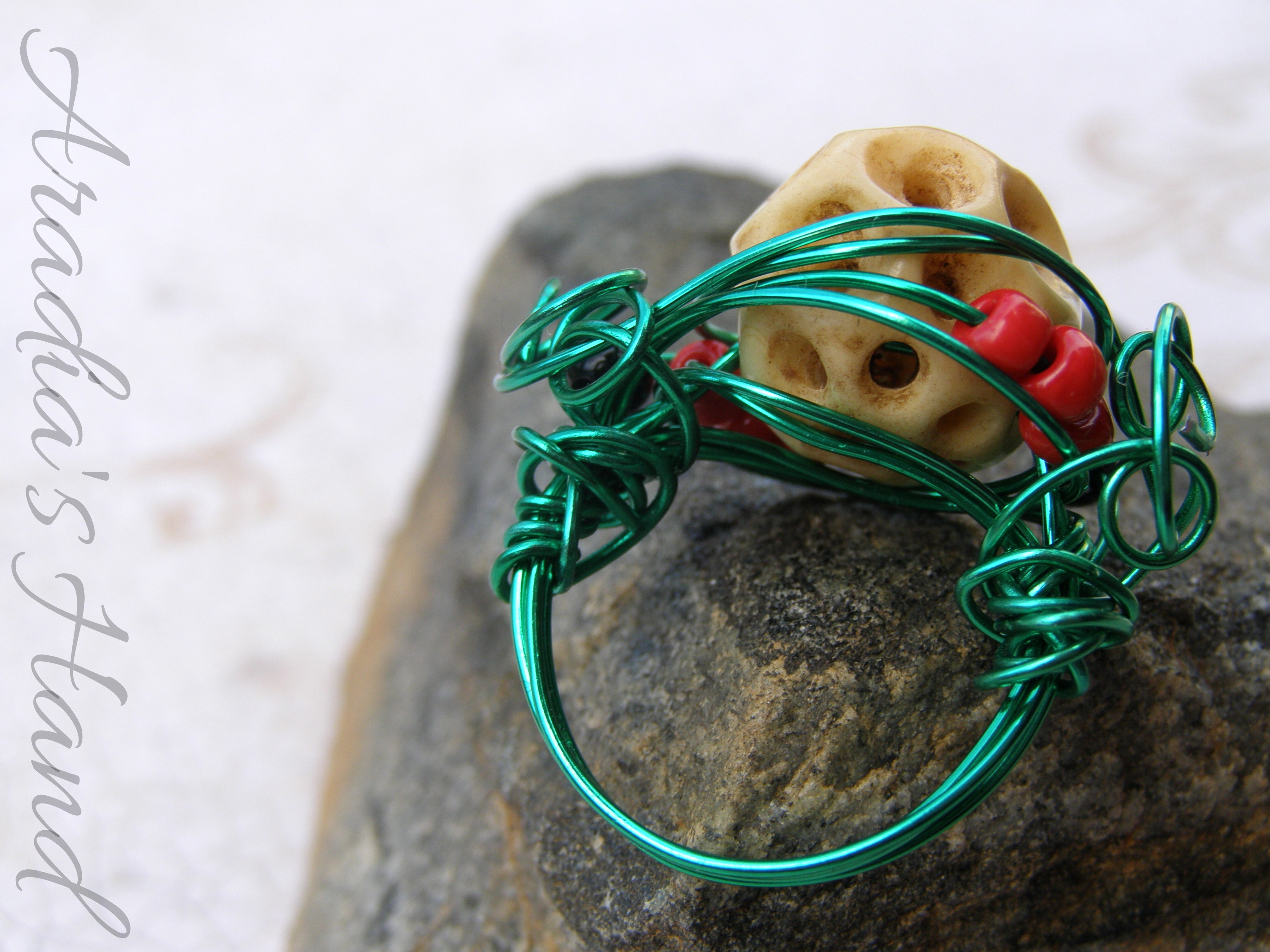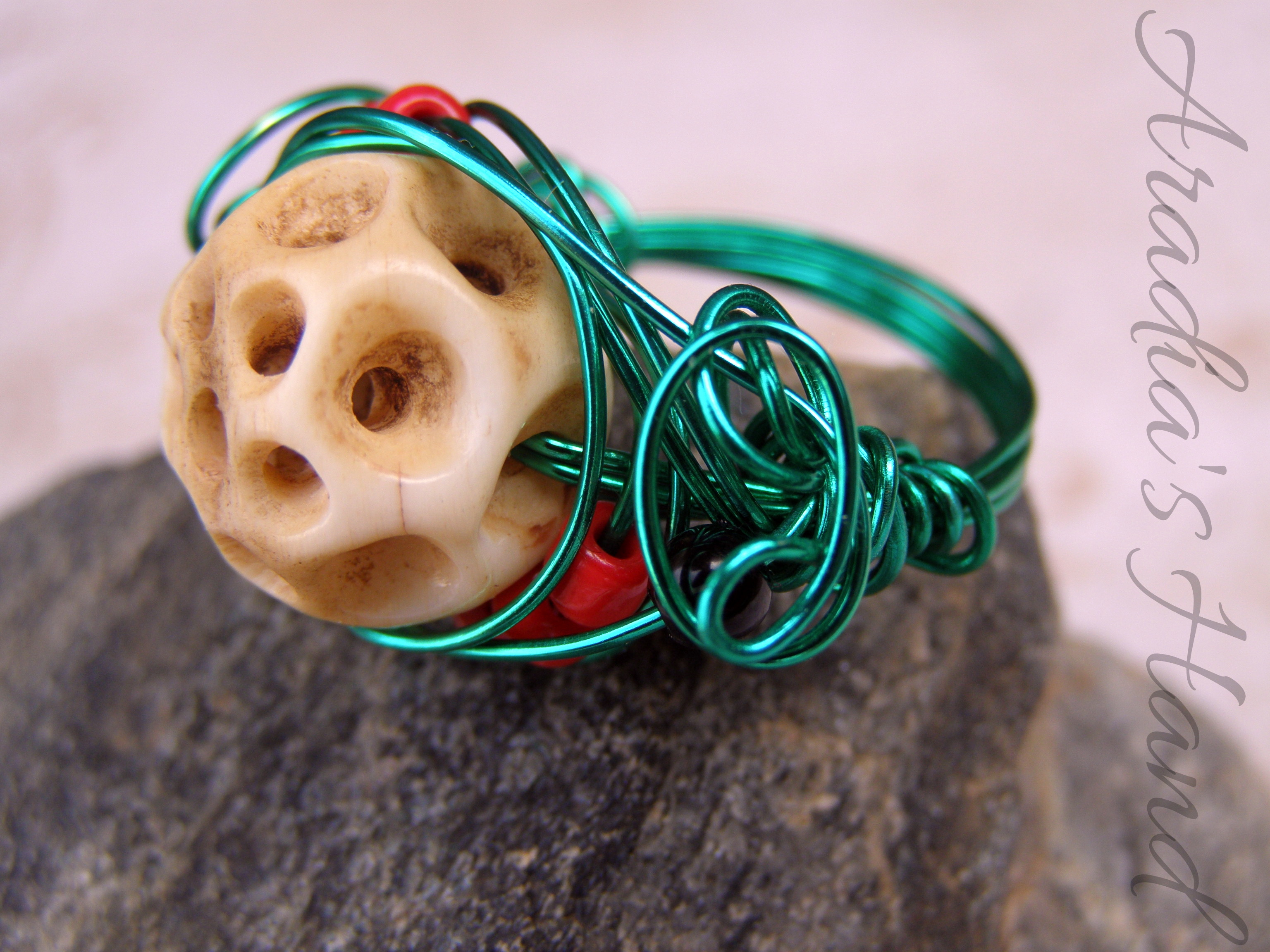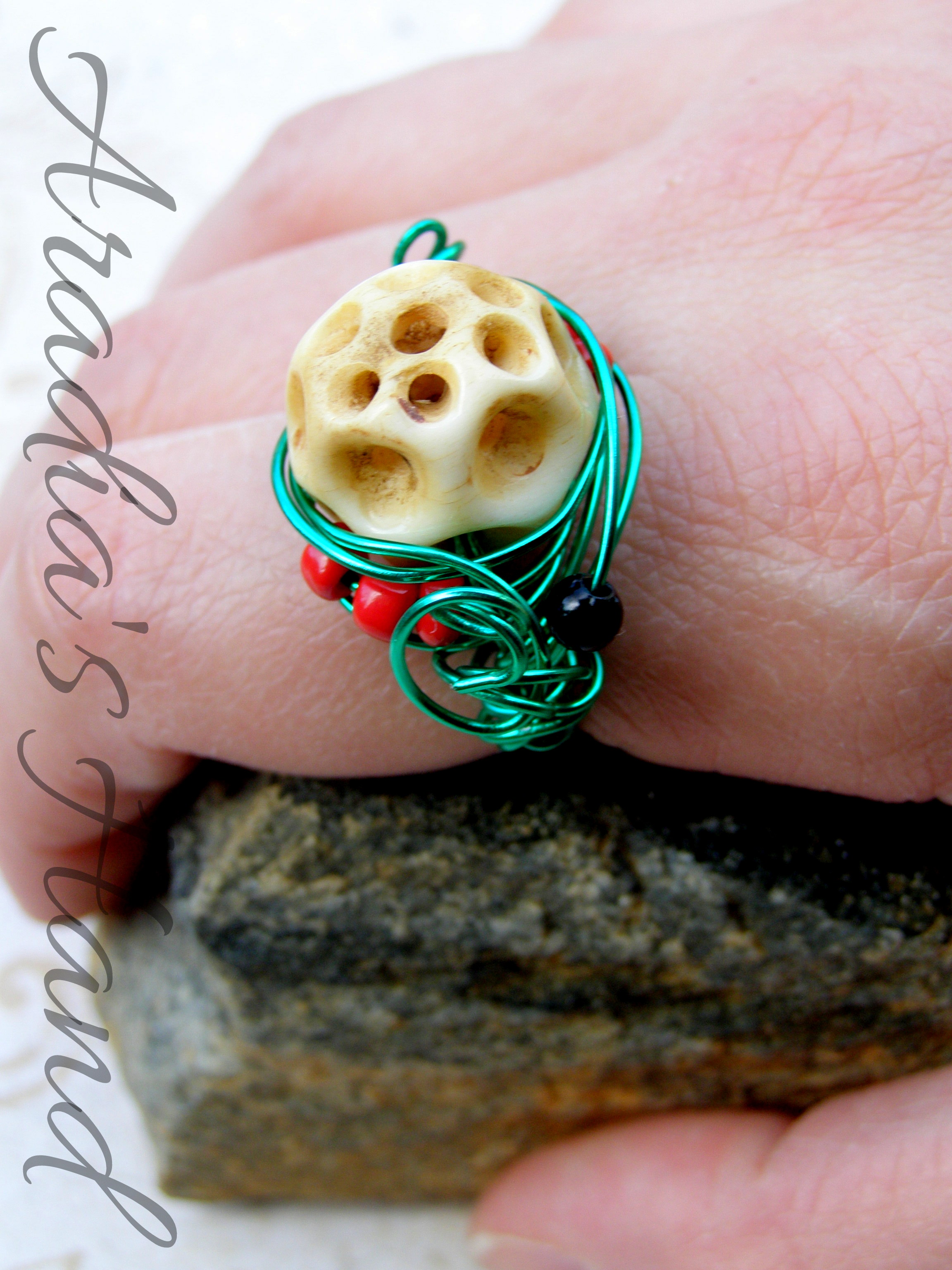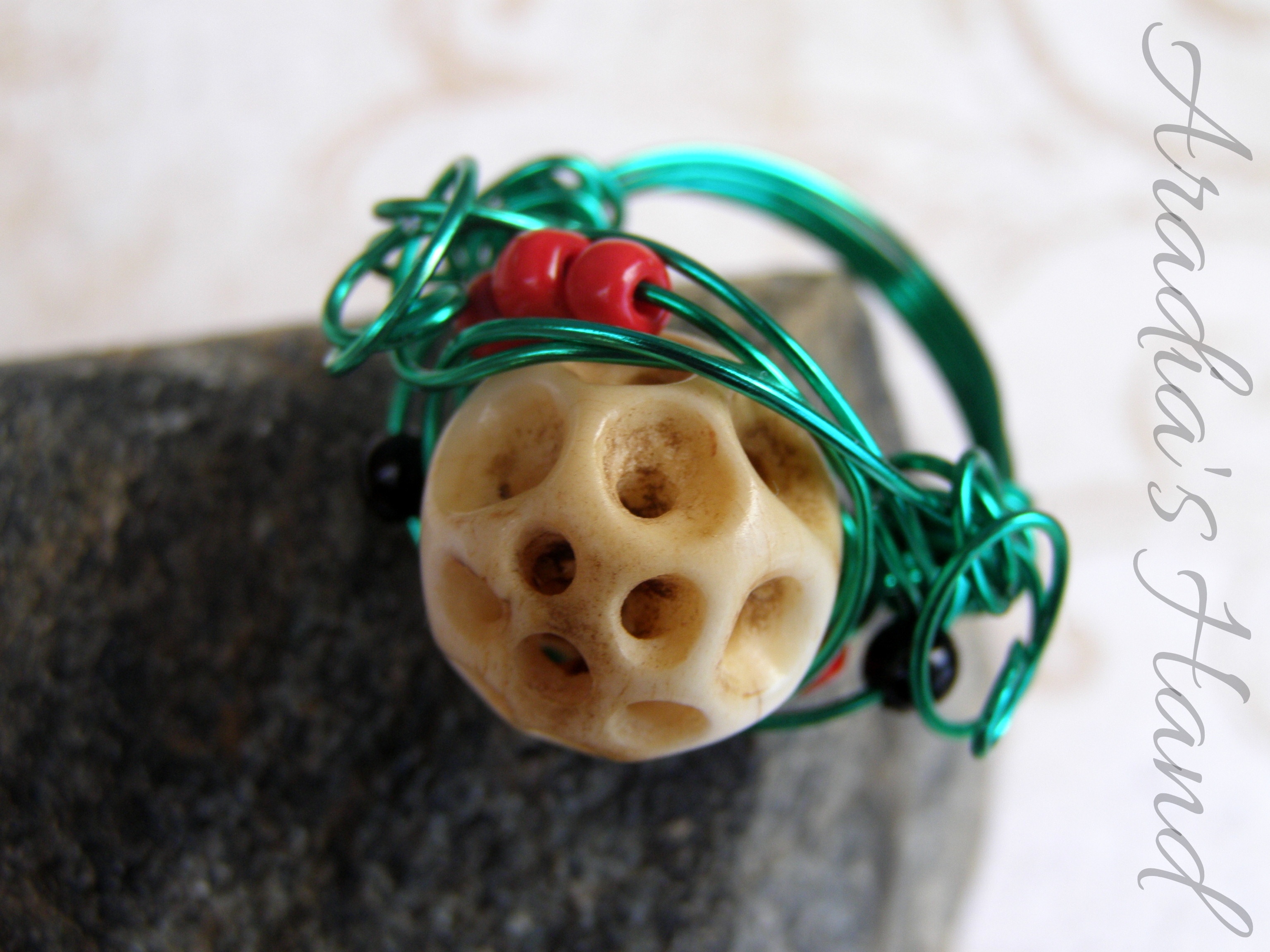 Truly after all is said and done I will always be a huge fan of the macabre. My love of thus and for the use of bone in general, both as a color and in materials themselves inspired the morbid beauty before you. Wire wrapping is another love of mine and when I saw the holey, honeycomb structure of this bead I knew it was destined to be inside a ring. Bright green wire reminds me of the surreal brightness of the cemetery lawns. The orange beads reminiscent of the vibrant funerary flowers scattered about and of course the bone and black beads themselves - a rather cadaverous reference. The entirety of this ring reminds me very much of a skull peeking up through it’s grave, lamenting the life it once knew...