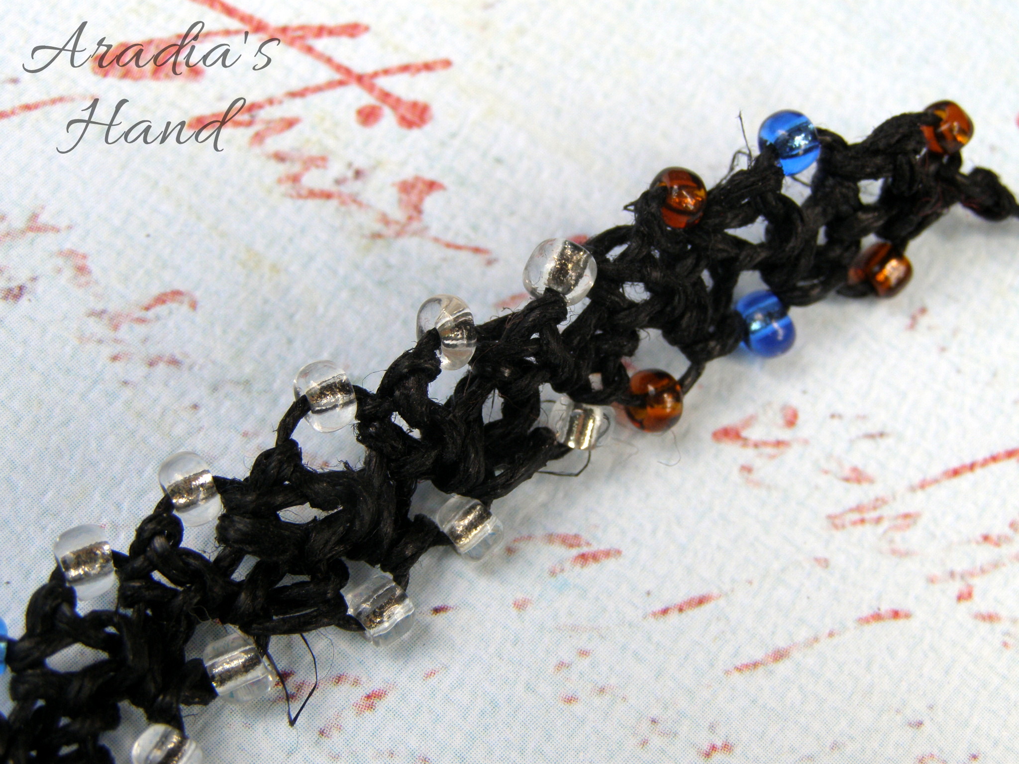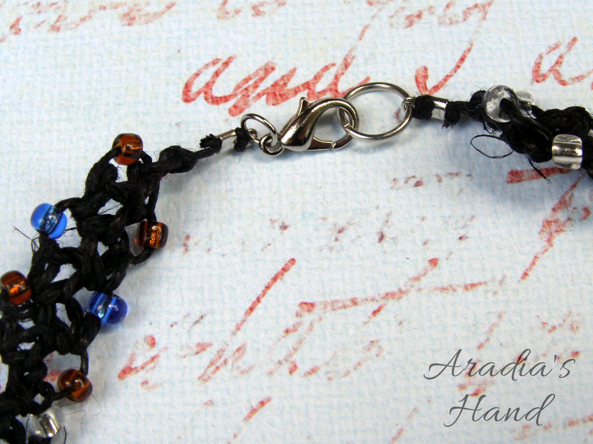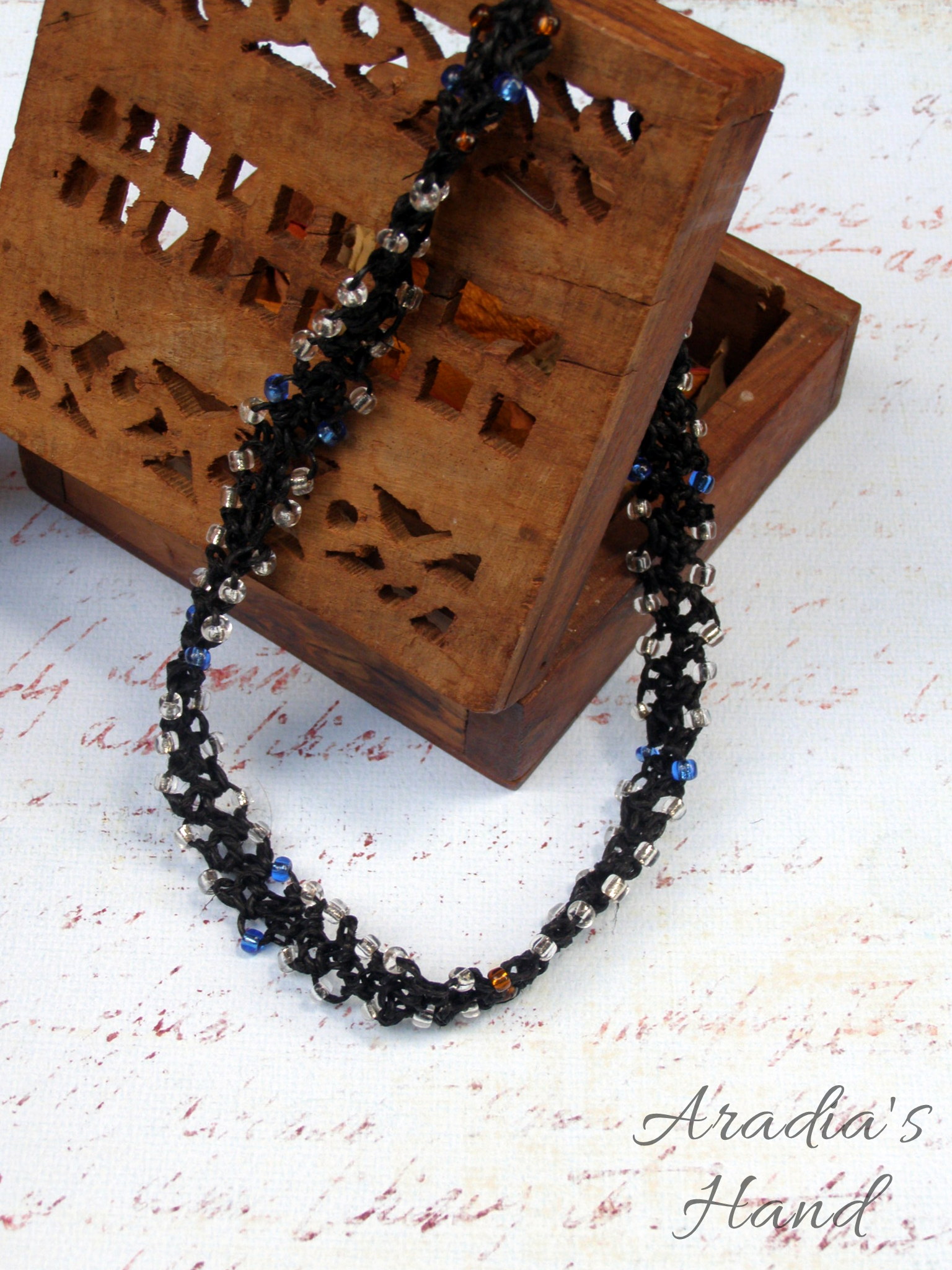The sea, deep and wide and well beyond our reasoning. It holds an untold and peaceful beauty, a deep serenity with a tumultuous aspect as well. Connect with the flowing calm of the watery depths. Turkish Lace adds a delicate and sturdy aspect to this design, yet allows some stretching. And a plethora of glass seed beads balance with black hemp.