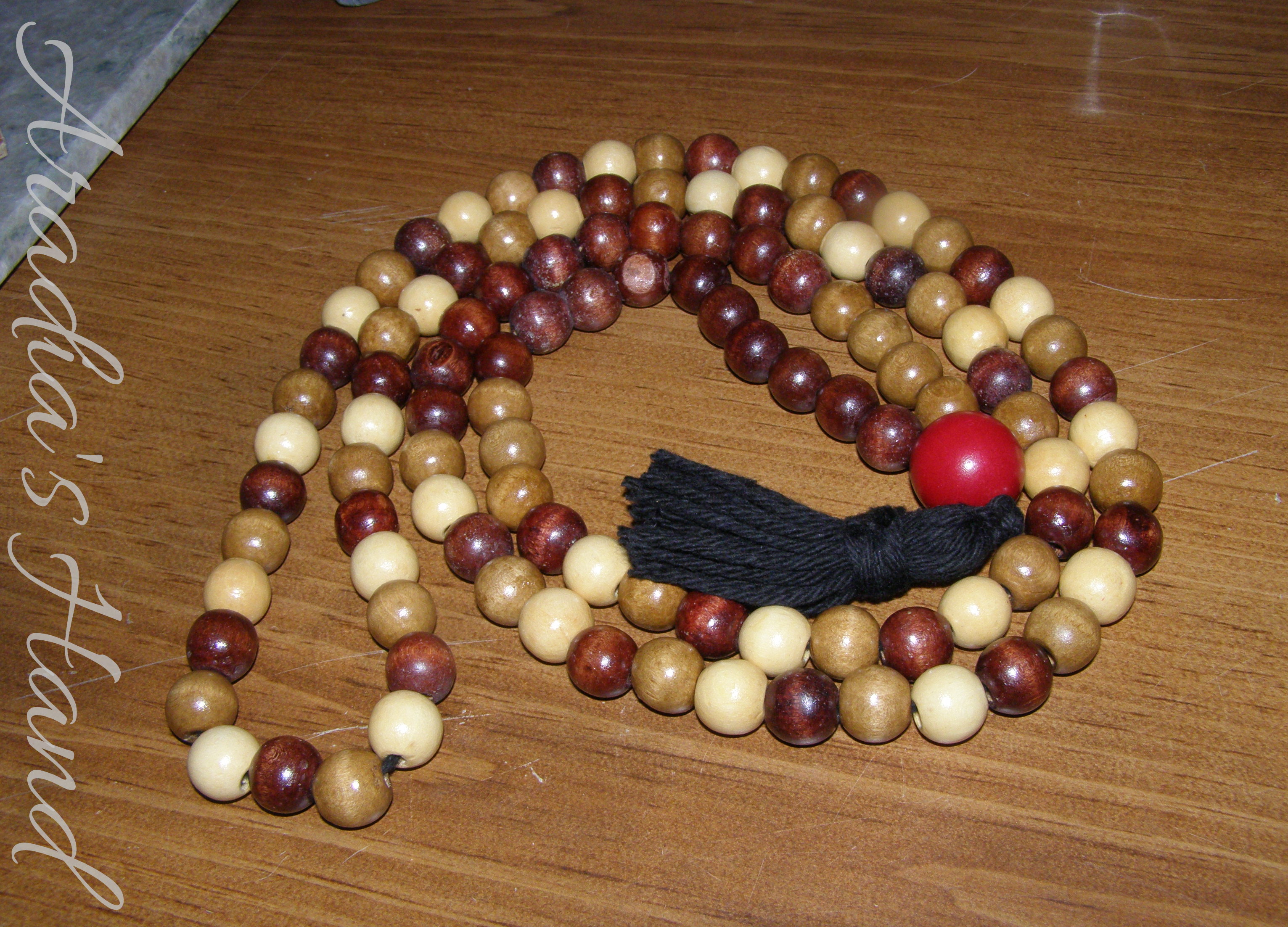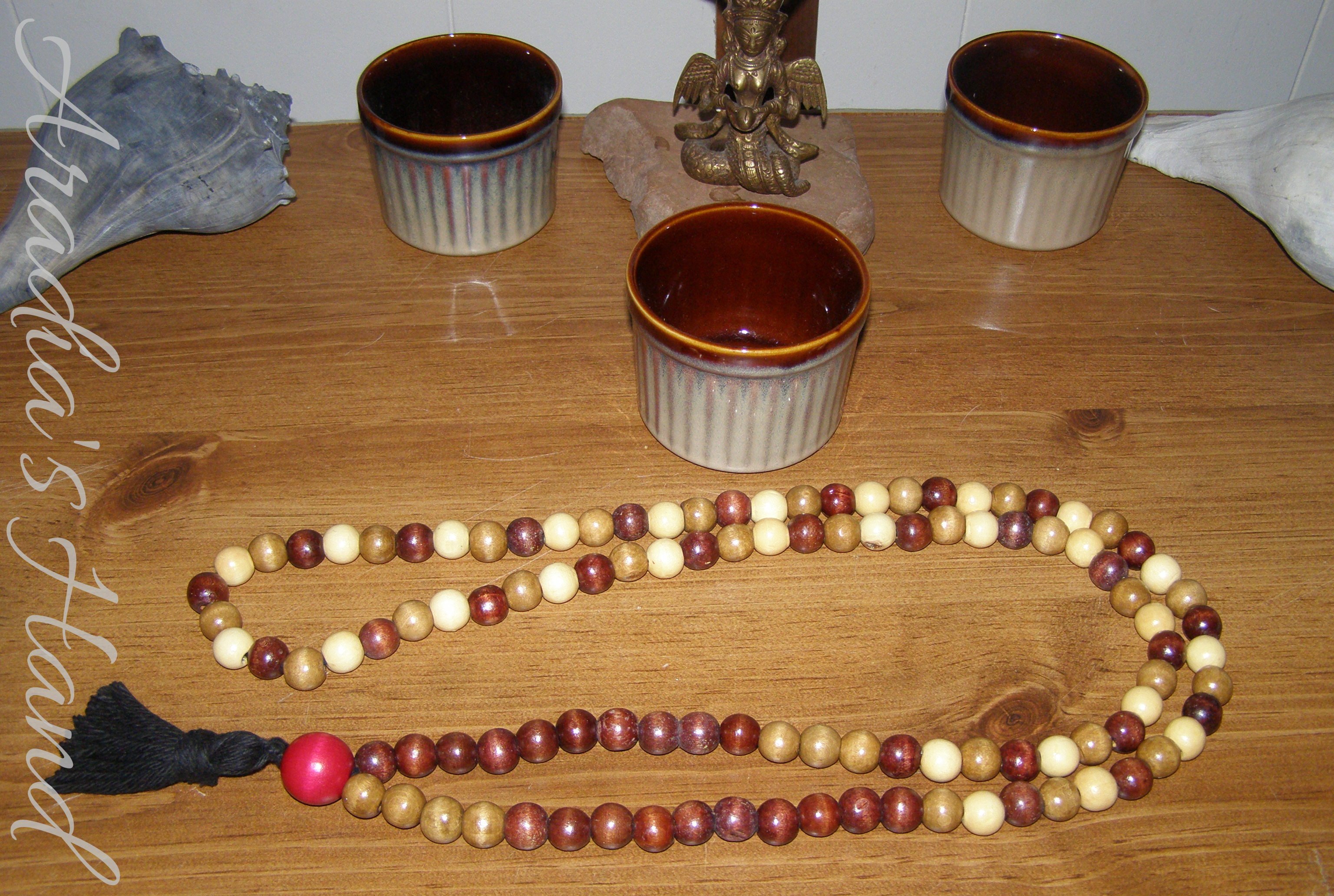 Since I started making malas I’ve been dying to make a traditionally styled one. I made this one with 109 wooden beads strung on black cotton yarn. Primarily in three shades of brown (dark, medium, and one resembling an unfinished look). The strands ends in the “stupa” where I used a larger red bead. The strand was finished off with a traditional tassel.