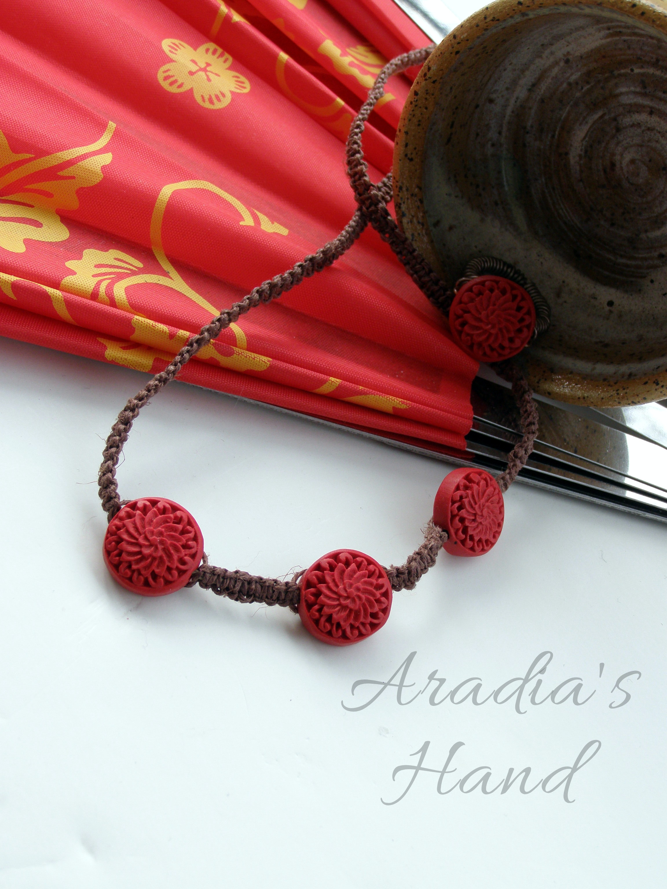 Made with aluminum wire, hemp, nickel plated findings, & Cinnabar beads.