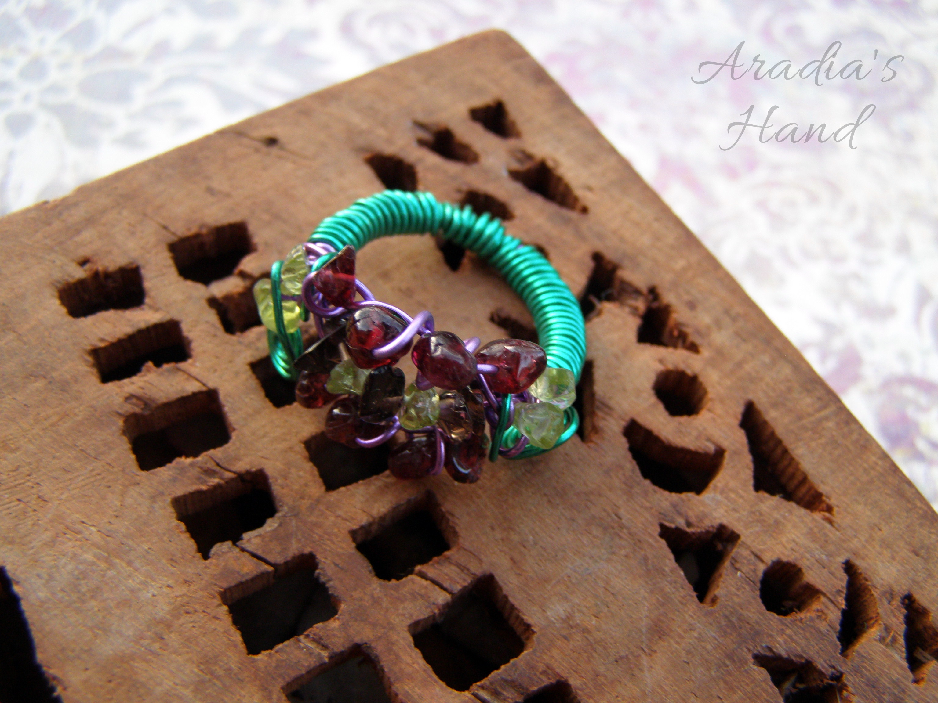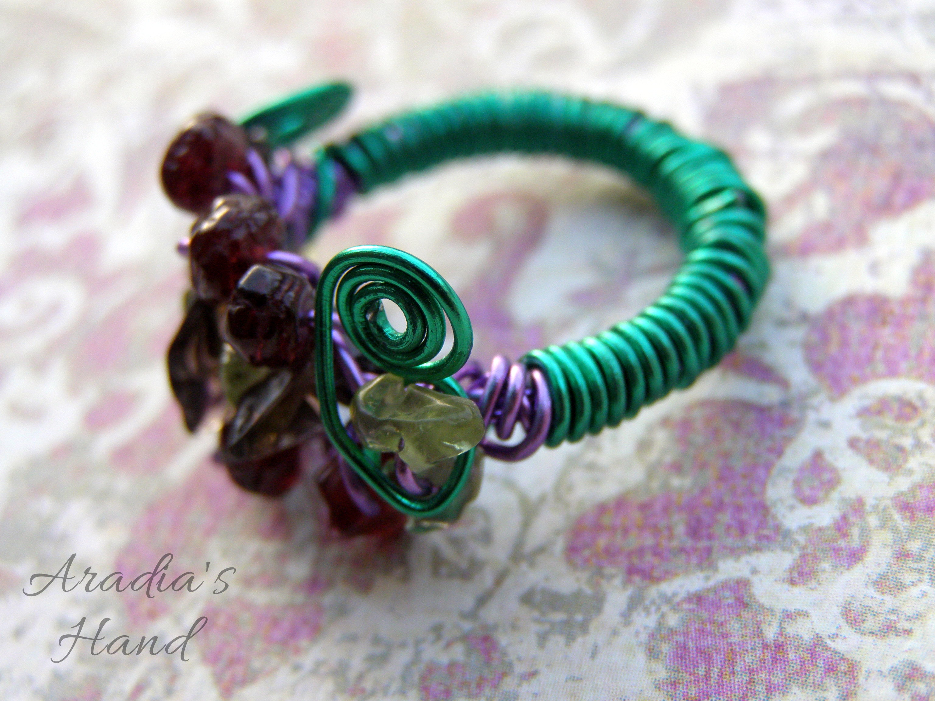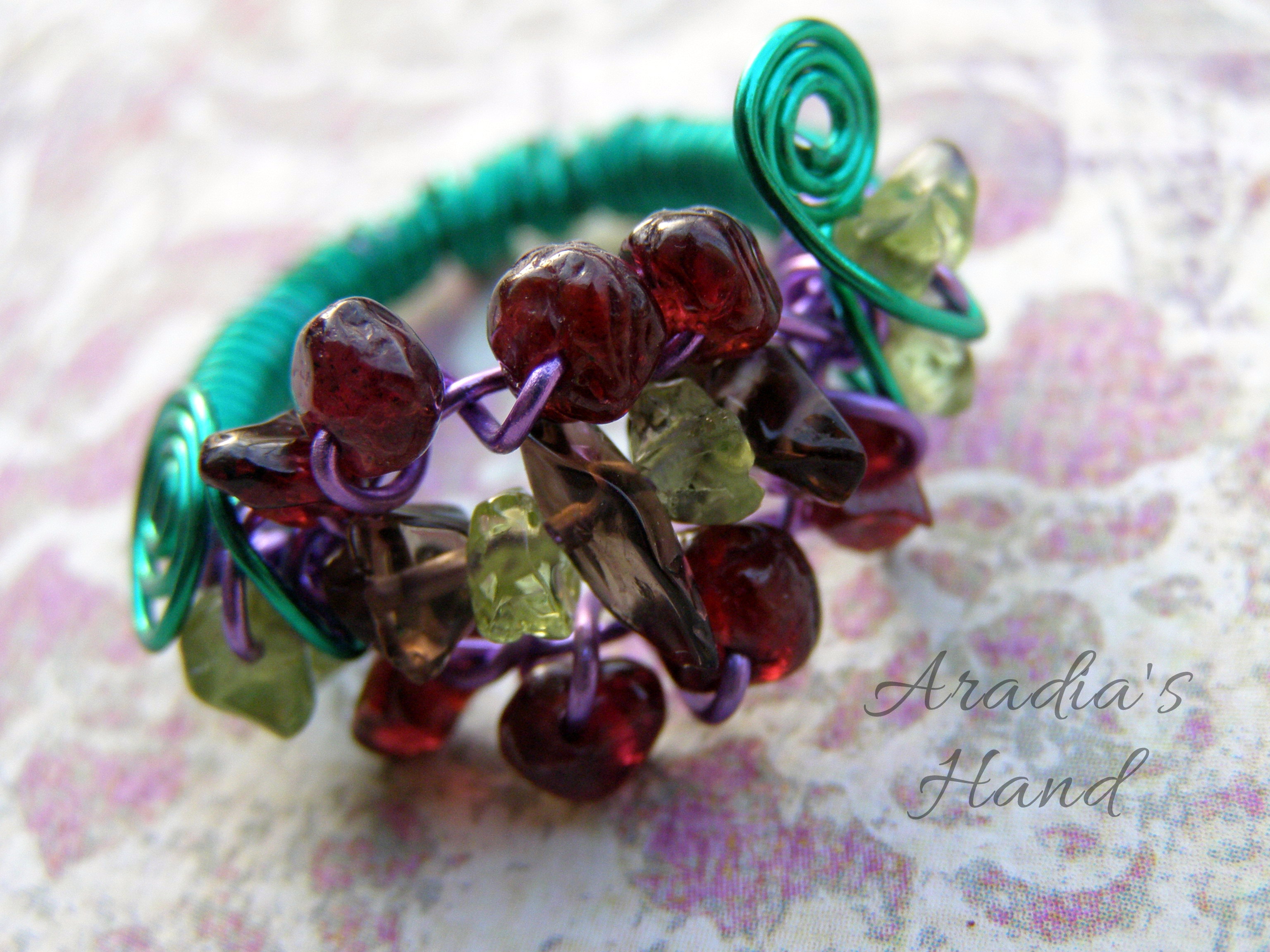 Another ode to Dionysos and his wild followers the Maenads. Chips of Garnet and Peridot represent grapes, the sacred fruit associated with the wine god. Punctuated with Smoky Quartz referencing that air of mystery that surrounds His followers. Bright green aluminum wire forms the vining tendrils of ivy that are also sacred to Dionysos. I coiled the wire around the band to form an extra layer of comfort as you wear it too!