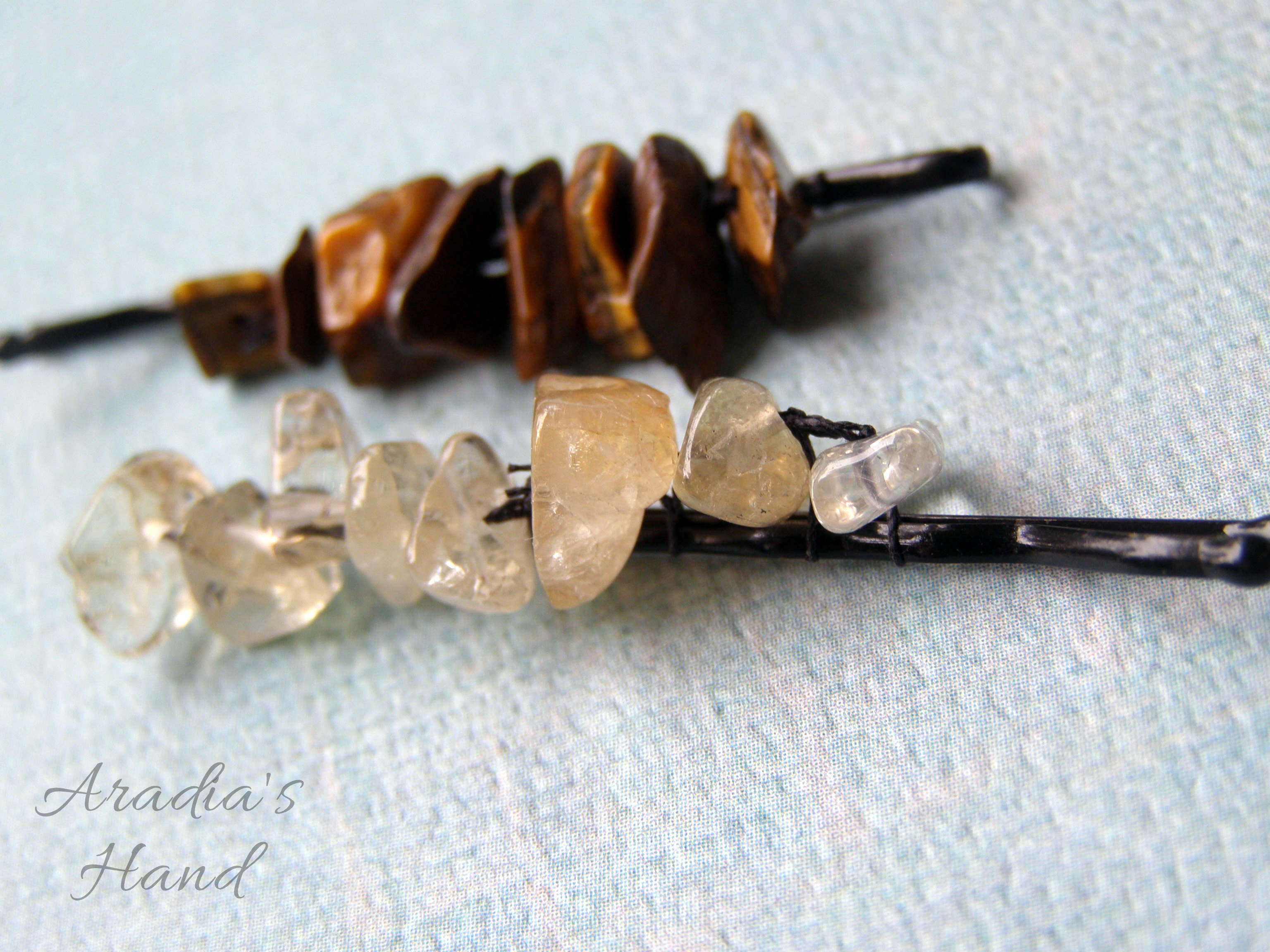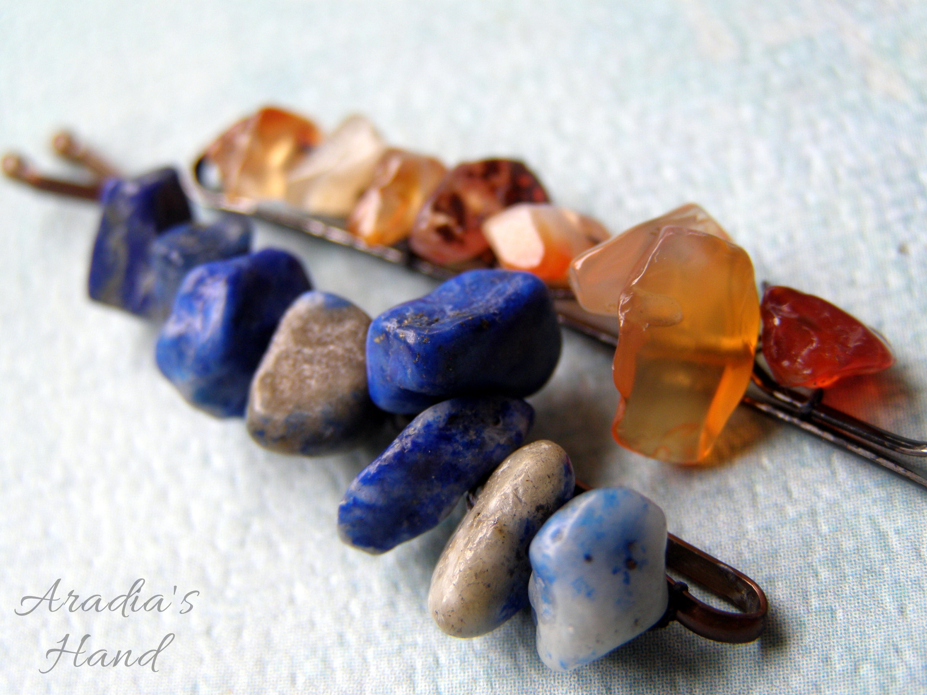 Made with bobby pins, thread, Citrine, Lapis Lazuli, Fire Agate, and Yellow Tiger’s Eye bead chips.