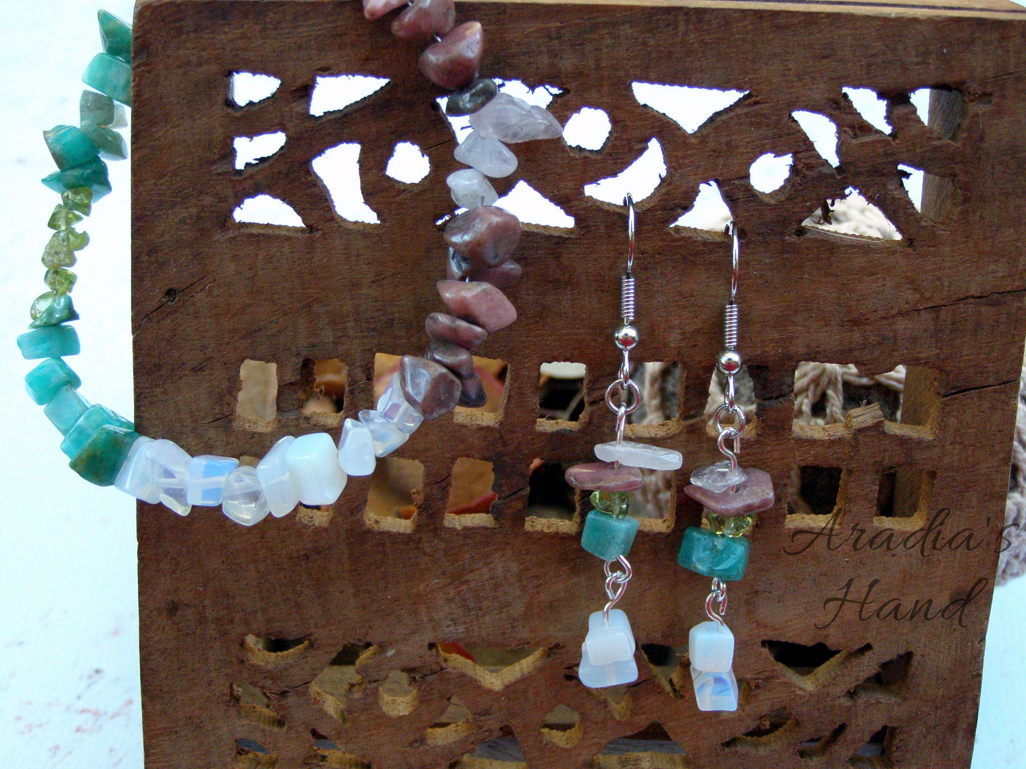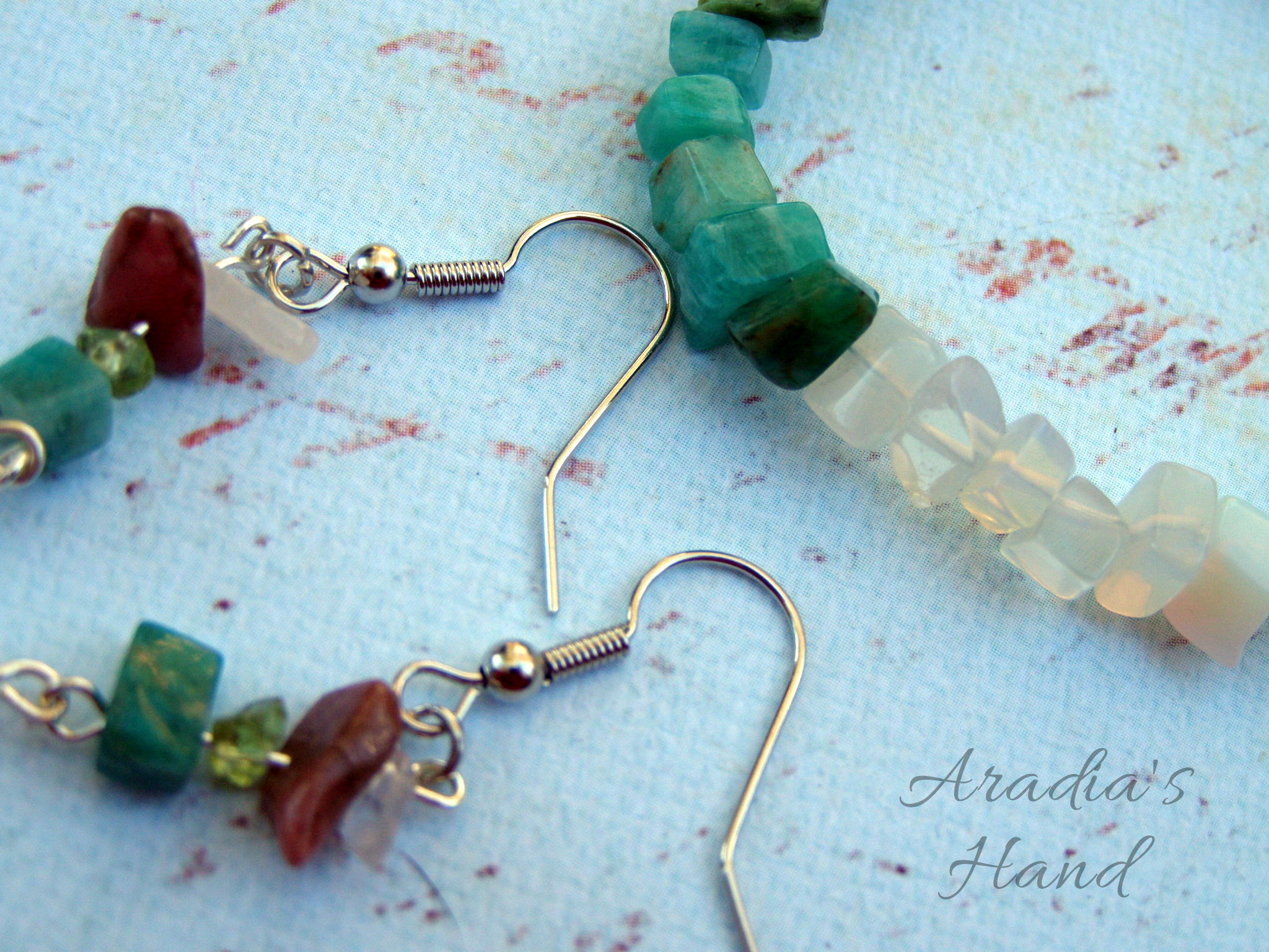 Made with French earwires, beading wire, nickel plated findings, Rose Quartz, Rhodonite, Peridot, Amazonite, and Moonstone bead chips.