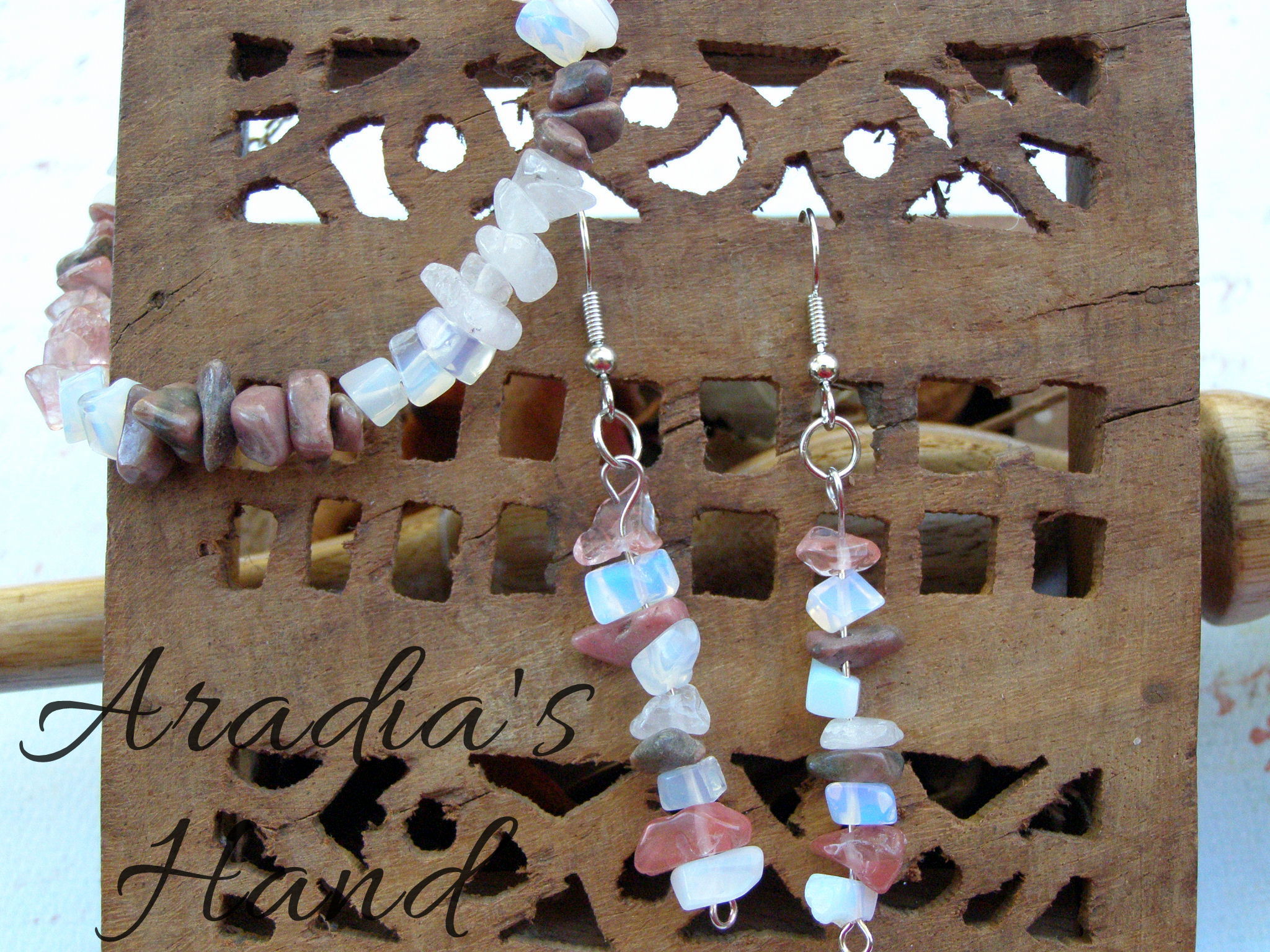 Made with French earwires, beading wire, nickel plated findings, Cherry Quartz, Moonstone, Rhodonite, and Rose Quartz bead chips.