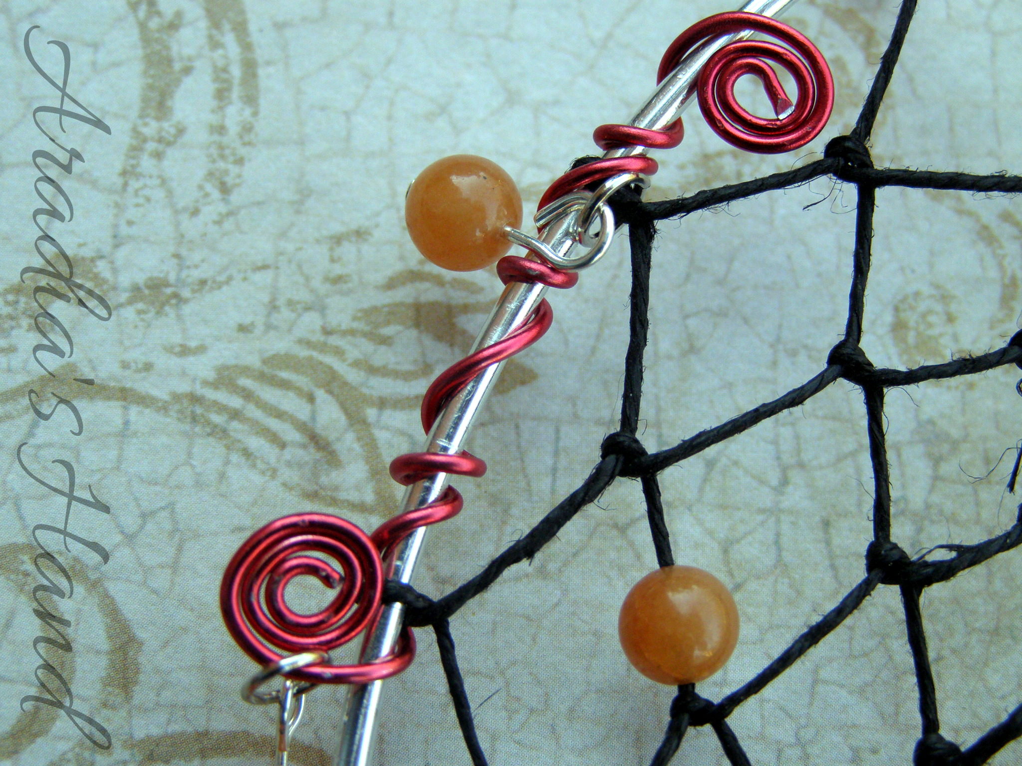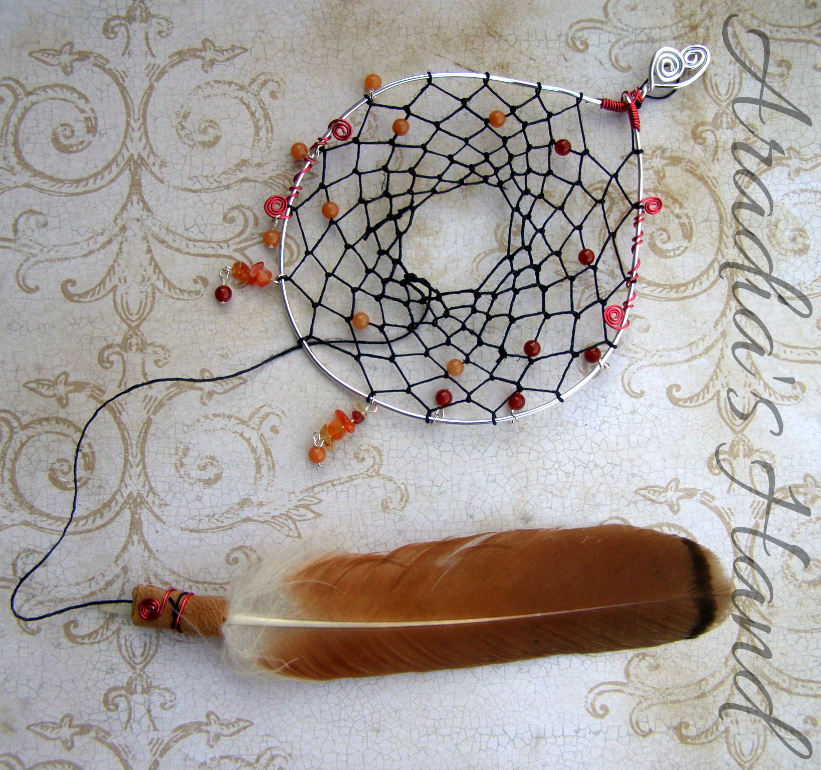 Dreamcatchers are used to help guard against nightmares while we sleep. Good dreams pass through the middle of the dreamcatcher while nightmares get stuck in the webbing. This particular dreamcatcher is non-traditionally made and themed with fire energy. Formed in the shape of a circle (the traditional shape used) it is strung with black hemp with Red Aventurine (stability & decisiveness) and Carnelian (passion & energy) beads within. Red wire spirals around the edges to capture the fire energy. A tail feather from a red tail hawk wrapped in tan leather hangs from the bottom, giving direction and foresight. Fire Agate (vitality & protection) is also paired with Red Aventurine & Carnelian at the bottom.