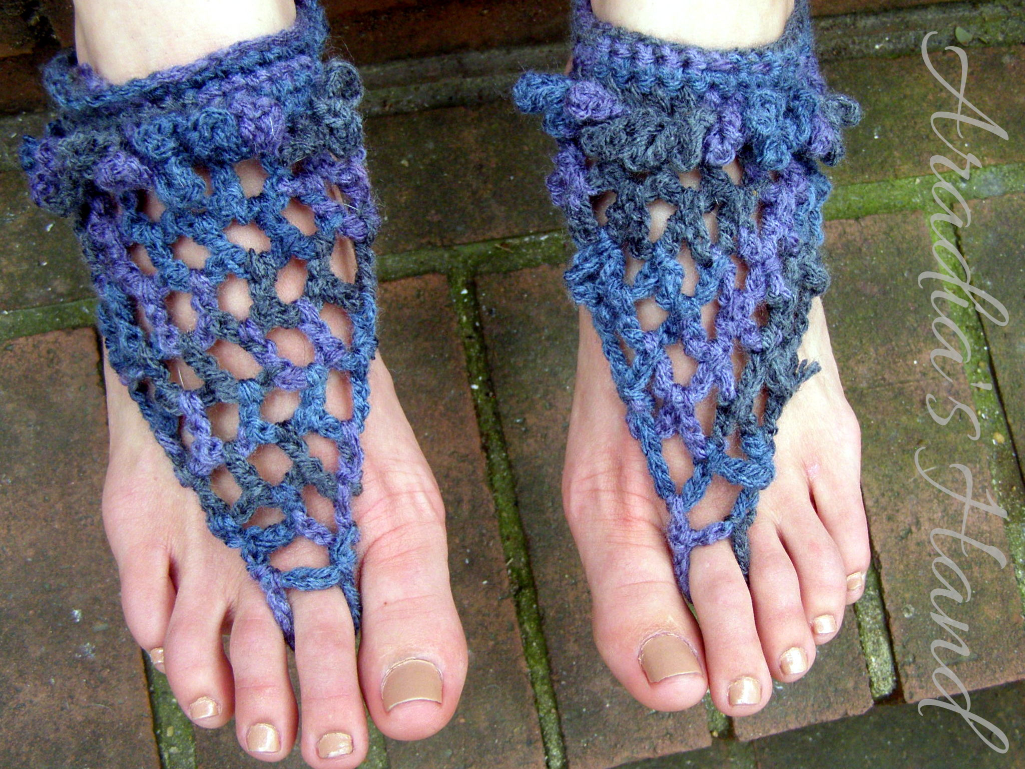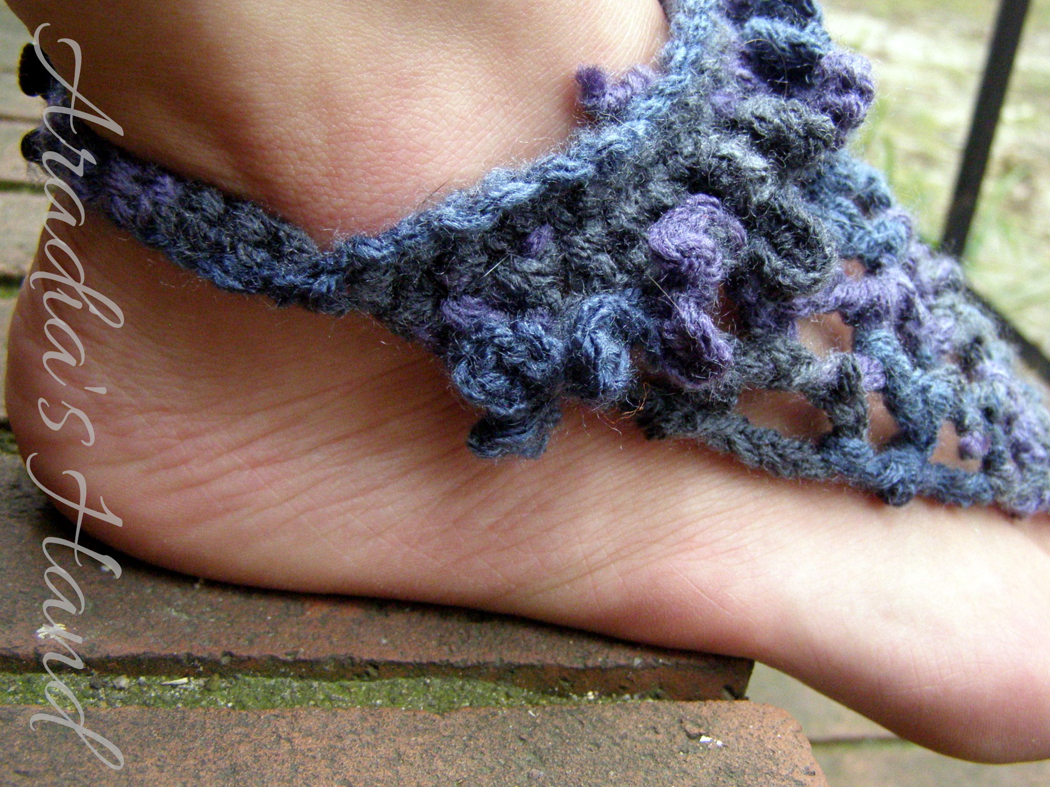 A little something for you, my dark & lovely darling...These one of a kind barefoot sandals are exactly what your Gothic Bohemian sensibilities crave. Connecting with your inner goddess & the Wild Divine Feminine Energy through the primal act of dance. I made these with variegated purple, blue, & gray yarn hailing to the energy of the night that calls to your soul. The final touch, an adorable skull & crossbones button as the enclosure. Add these one of a kind beauties to your wardrobe today if: