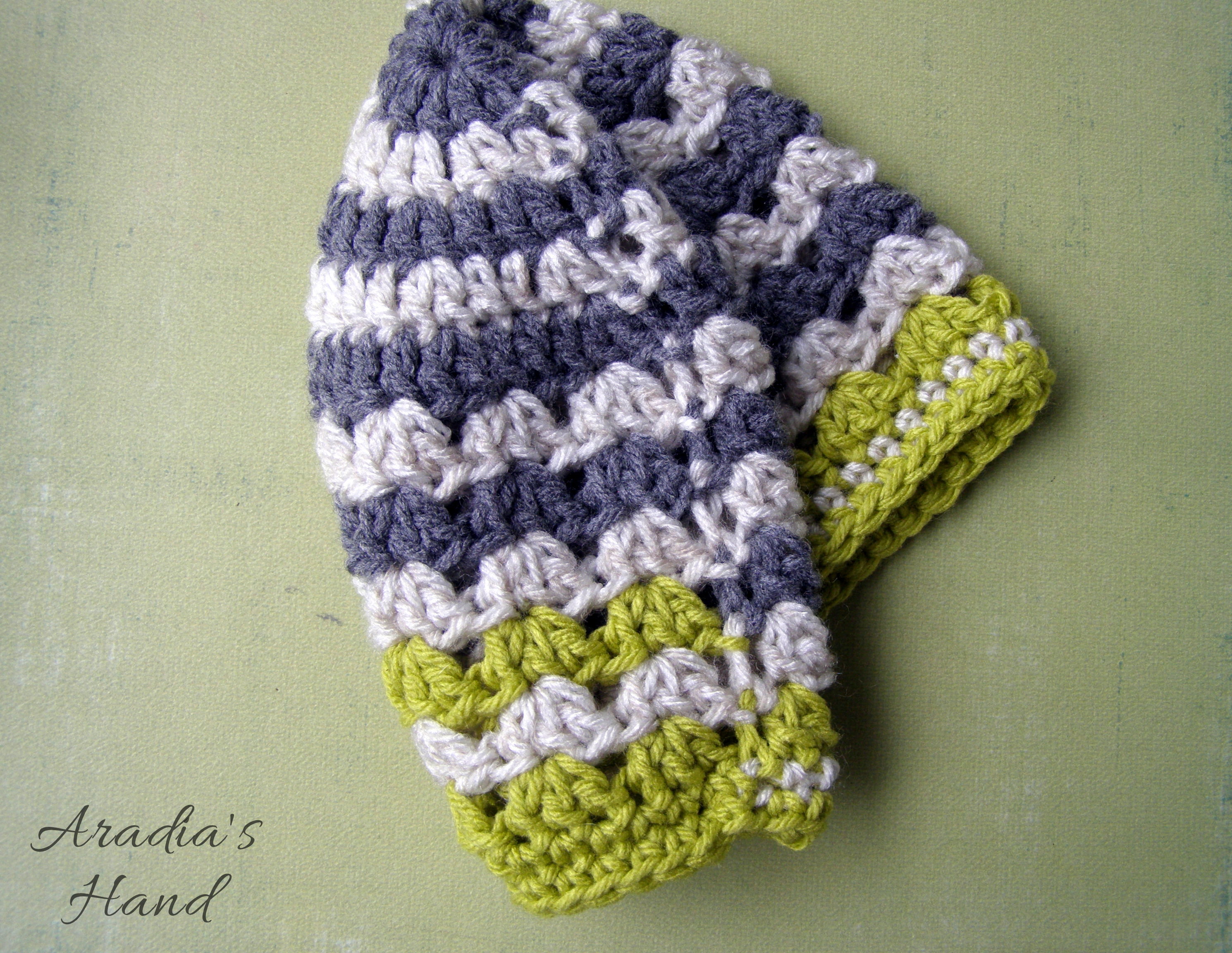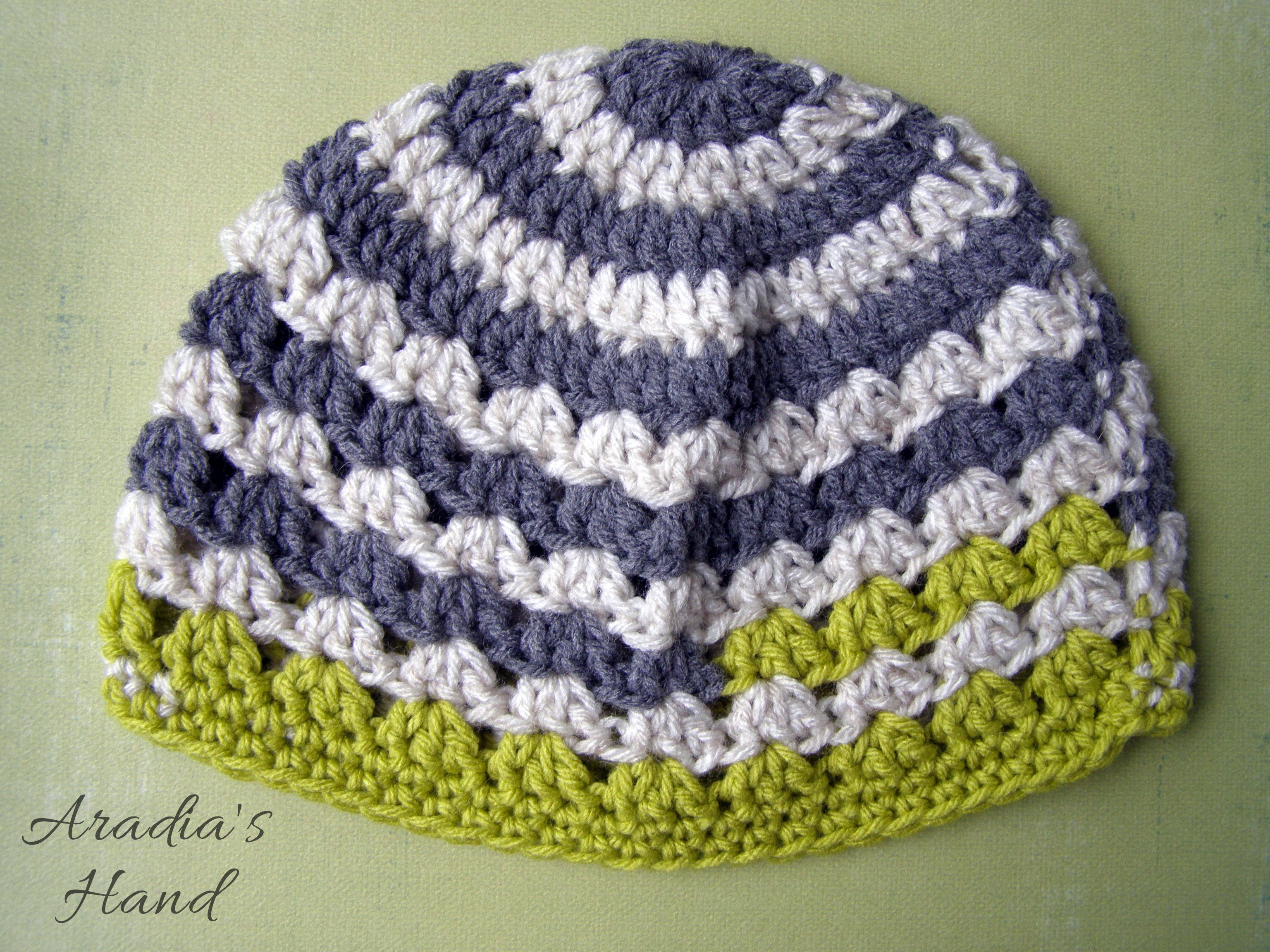Having made my other oddball it was really only a matter of time before this one came into being. I admit to having being bit by the odd bug...It seemed to start out fairly even keel alternating shades of gray with a slight variance in texture then… *BAM!* green, in your face! Take that normal! :p Since it’s unisex it will be adorable on your wee tot whether she is your little tomboy or tiny gentleman! Another exercise in ombre-y goodness that is nice and snug at the brim so it stays on, but light enough to wear year round!
