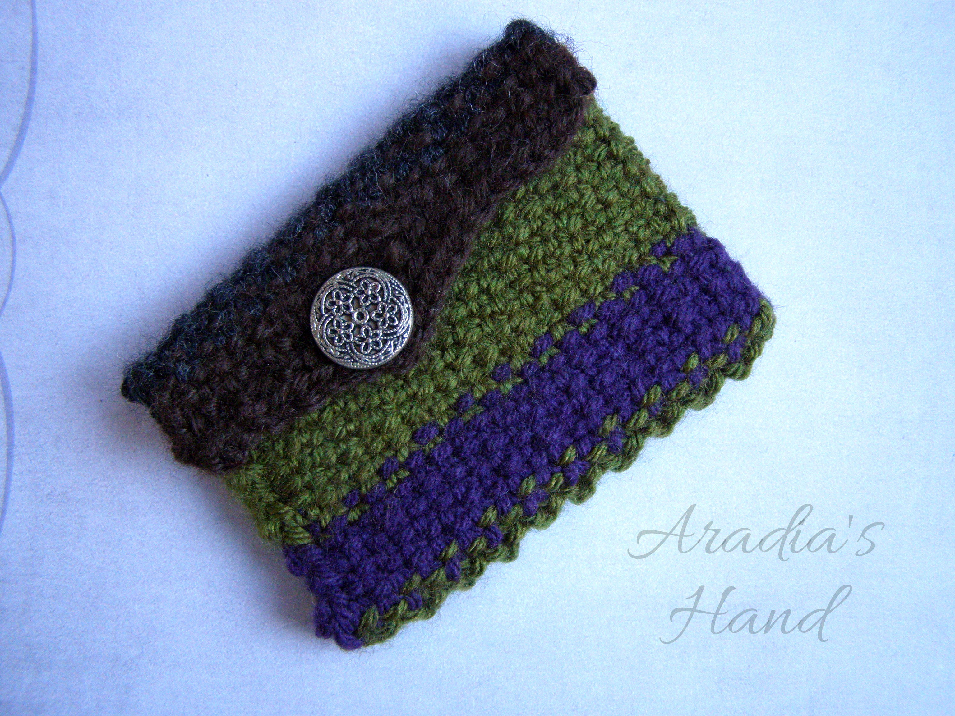 Would you venture into the forest at night on All Hallows Eve? The darkened trees casting wicked shadows in the bright moonlight. The dark and muted colors drew together in my mind and painted a solemn picture of a traverse out into the evening and I couldn’t help but capture that inspiration. This darling wallet encloses with a vintage button I inherited from my grandmother and has the kanji symbol for forest handstitched on the back. This little wallet hand knit in a nice dense stitch so you won’t lose any of your cards or coins, but small enough to easily slip in a back pocket or purse!
