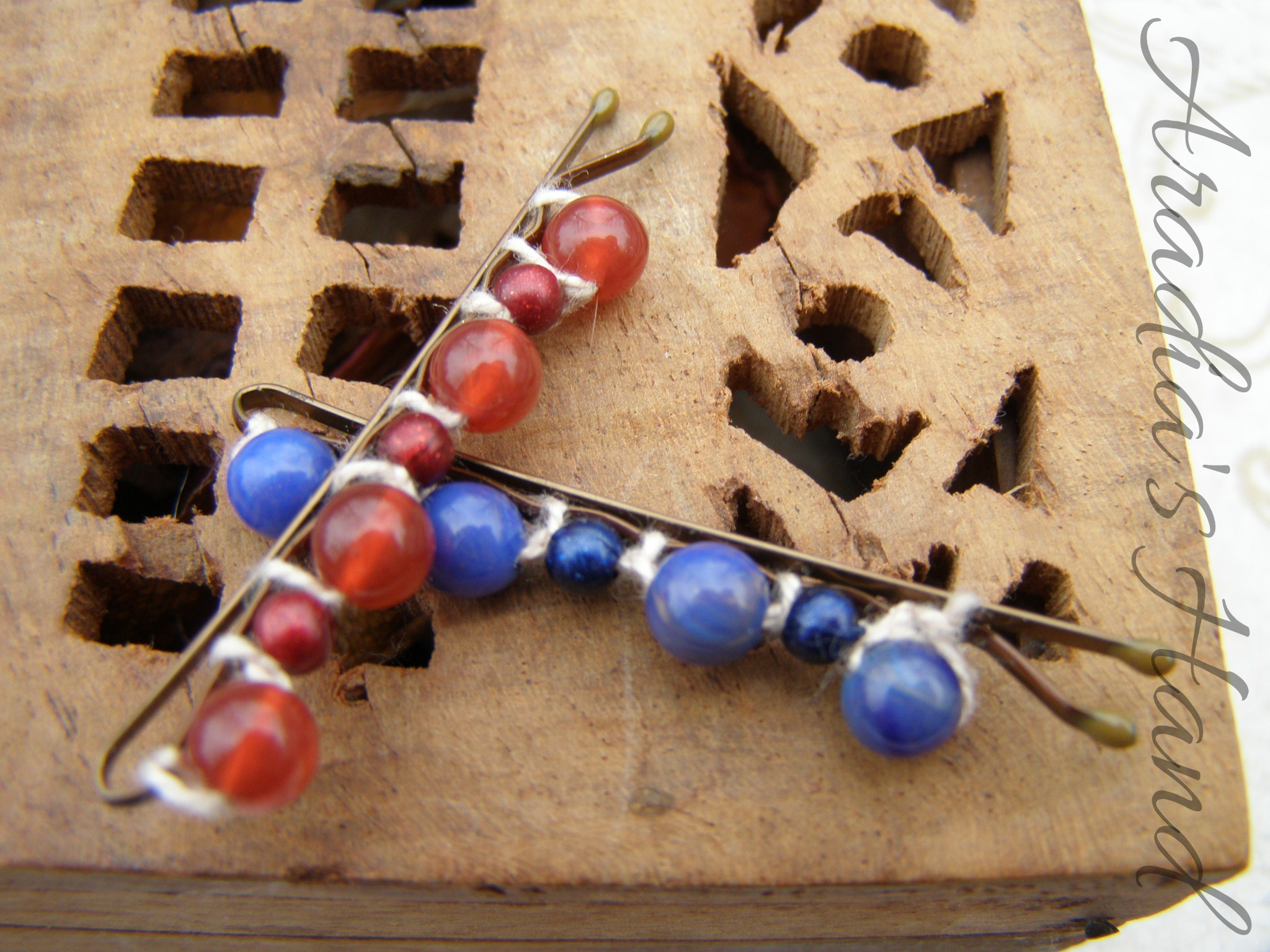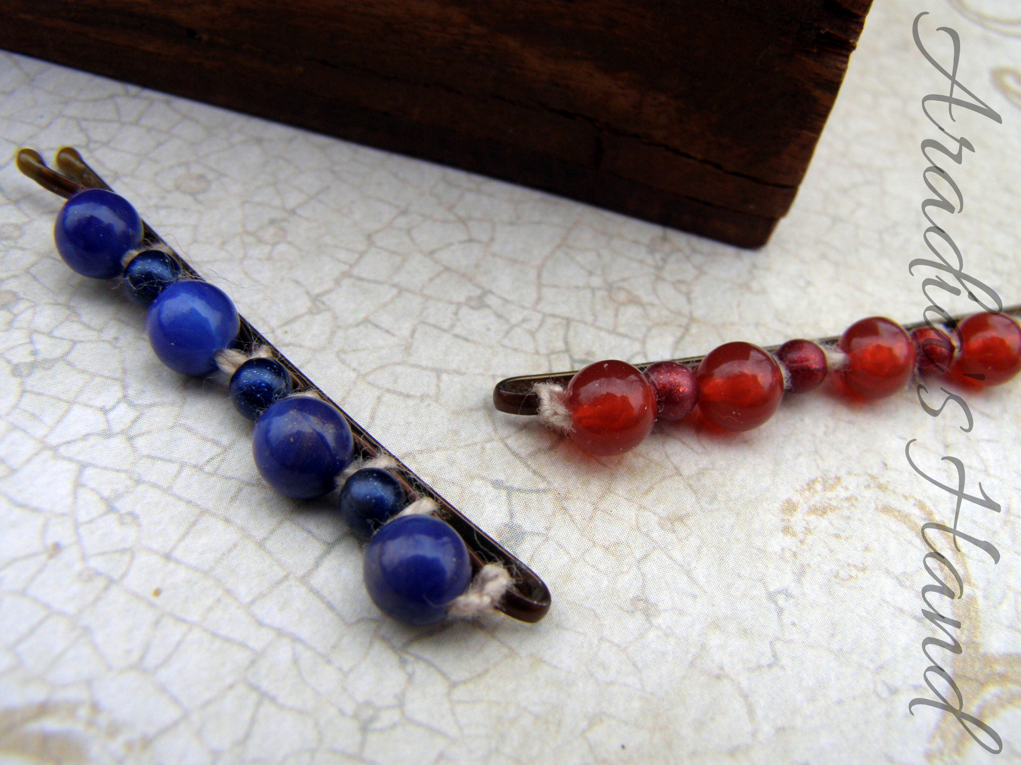 Seven beads alternate between large and small to spice up this hair pin into the perfect accessory. They were strung and knotted with beige thread. I used ocean blue and brick red plastic beads. This listing includes a set of four pins, two red and two blue.