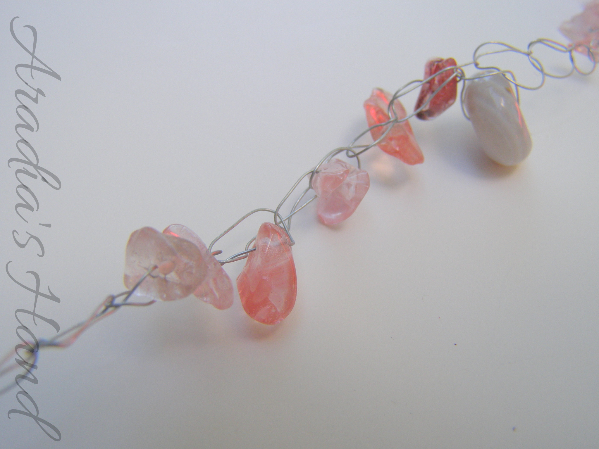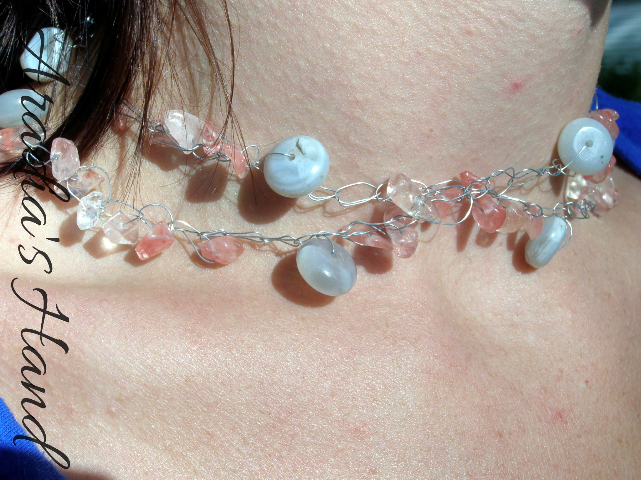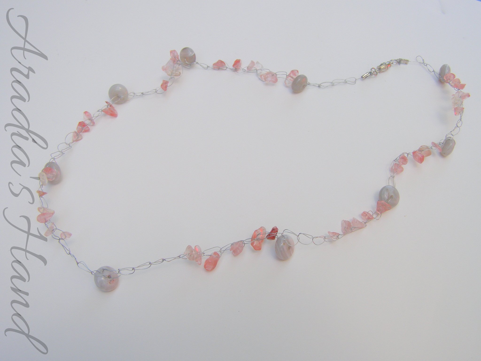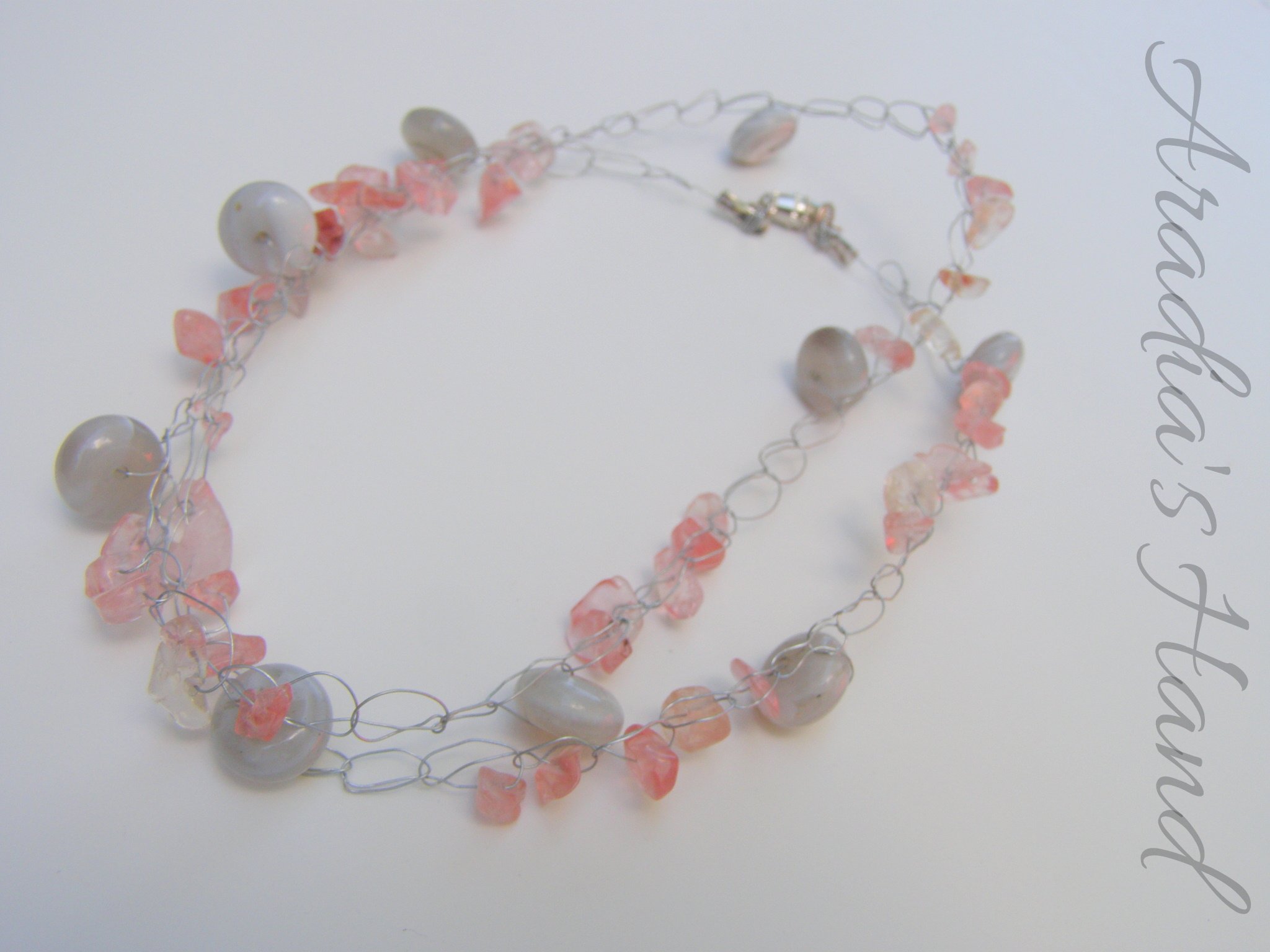 The perfect accent to your outfit...This lovely necklace may be worn long or double wrapped around your neck. Thin beading wire crocheted with semi-translucent pink cherry quartz and botswana agate beads. I saw these two beads and knew instantly what a lovely pairing they would make together. The crocheted wire makes a sort of webbed strand that accents the gossamer colors of the stones.