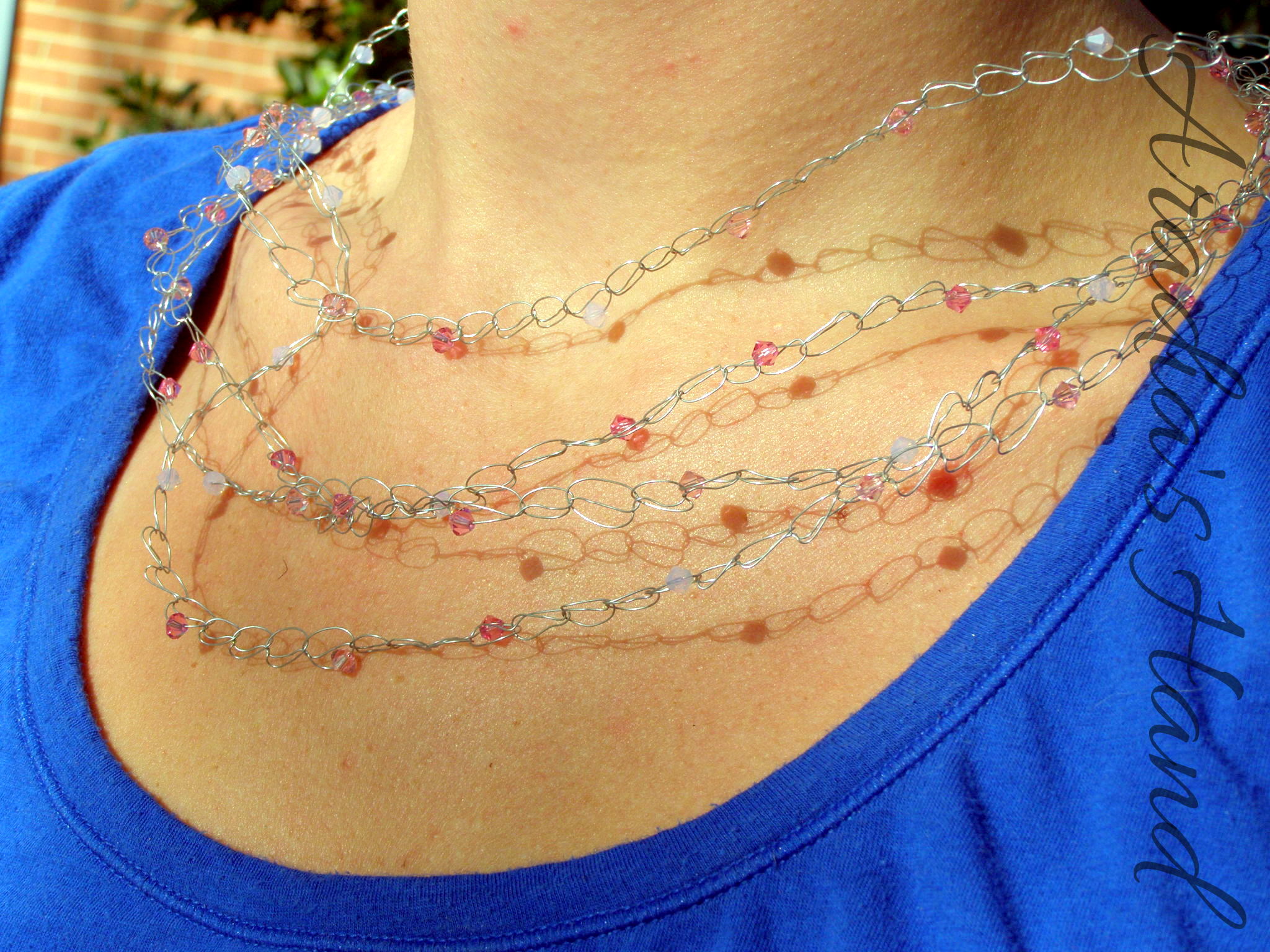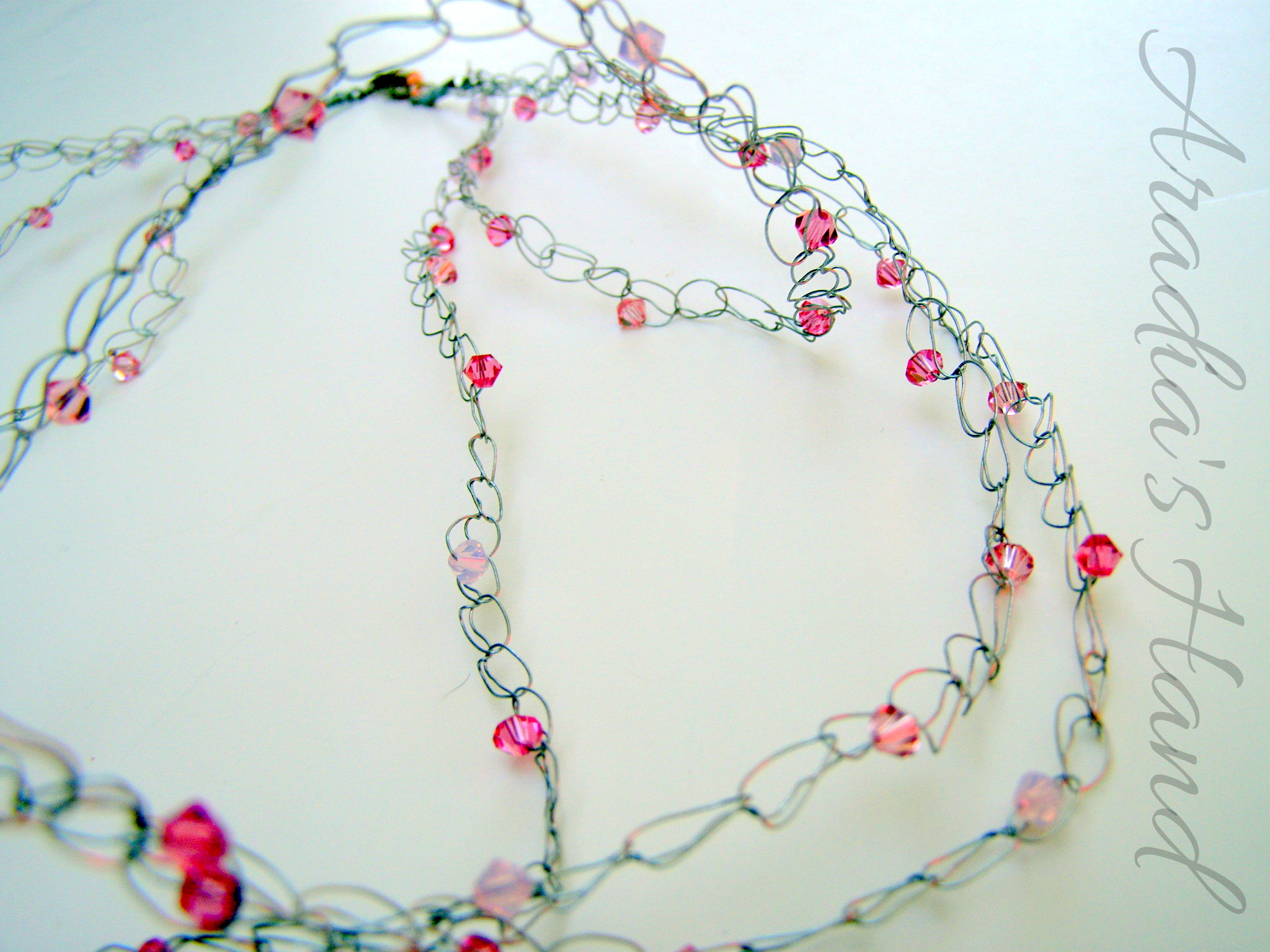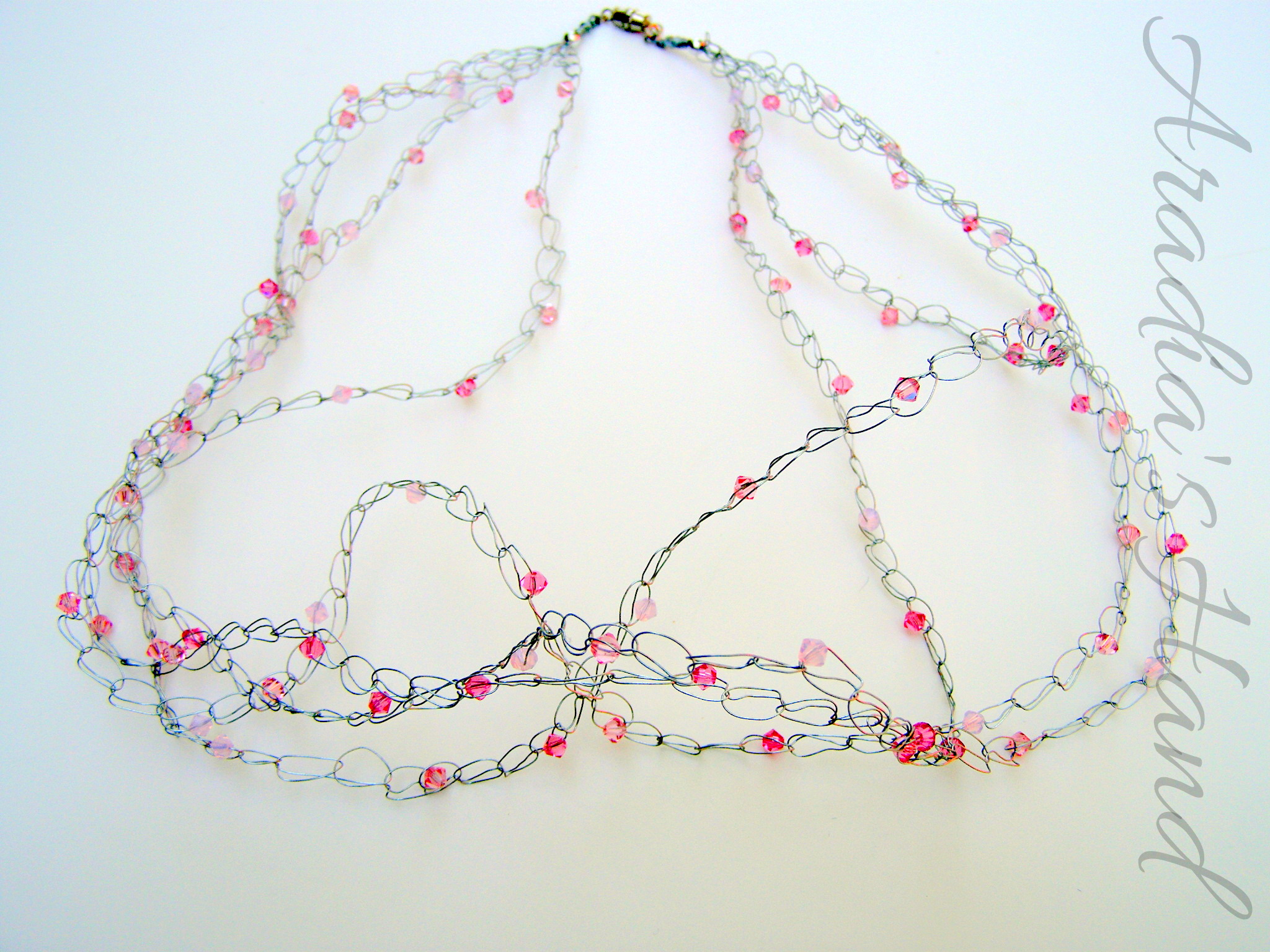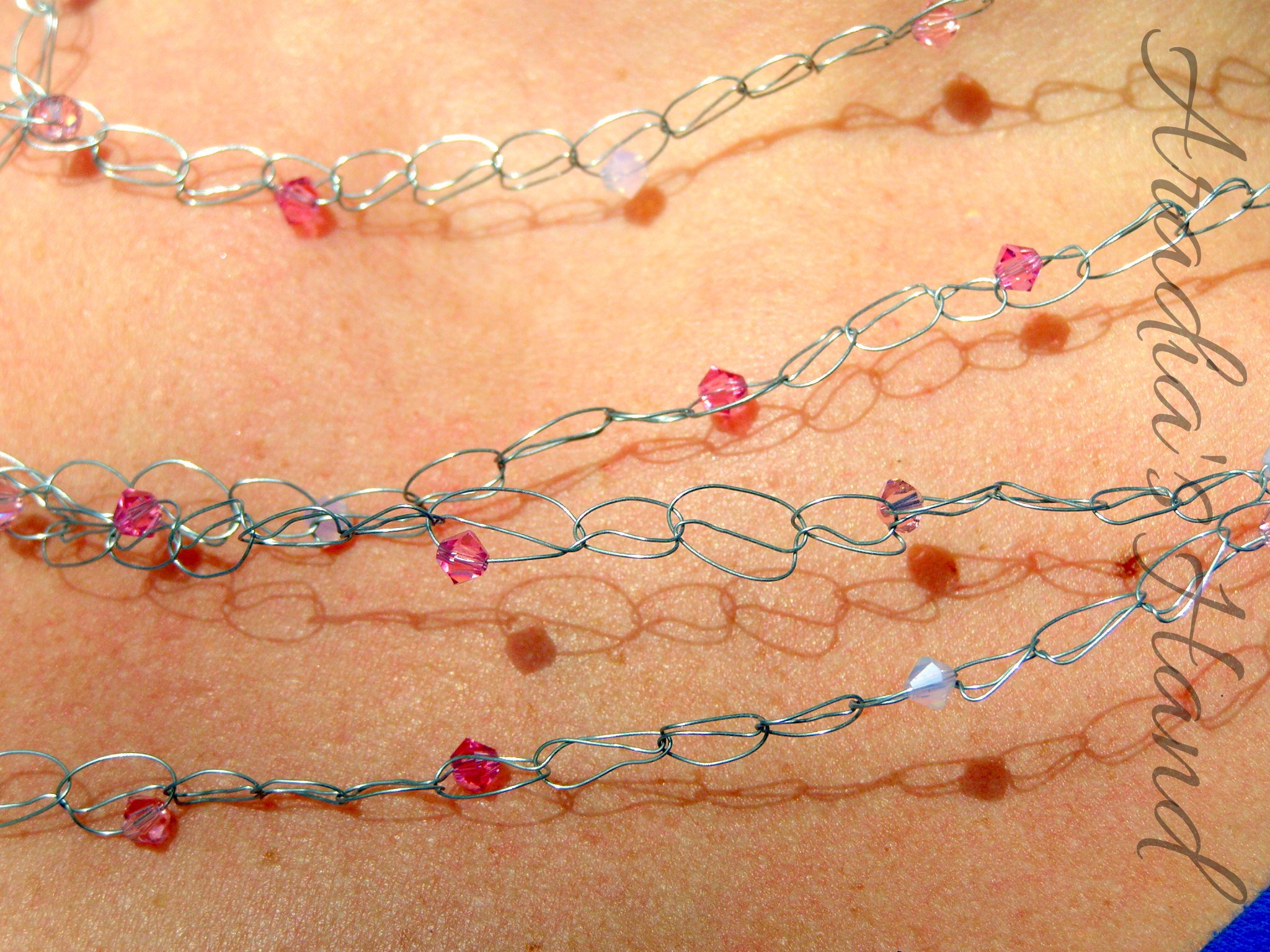 The perfect embodiment of the feminine energies. Connect with your delicate and strong feminine energy with this fun design. This beautiful necklace is crocheted with a thin beading wire with Swarovski crystals in varying shades of pink scattered throughout. Four wispy layers to adorn your neck in an organic style.