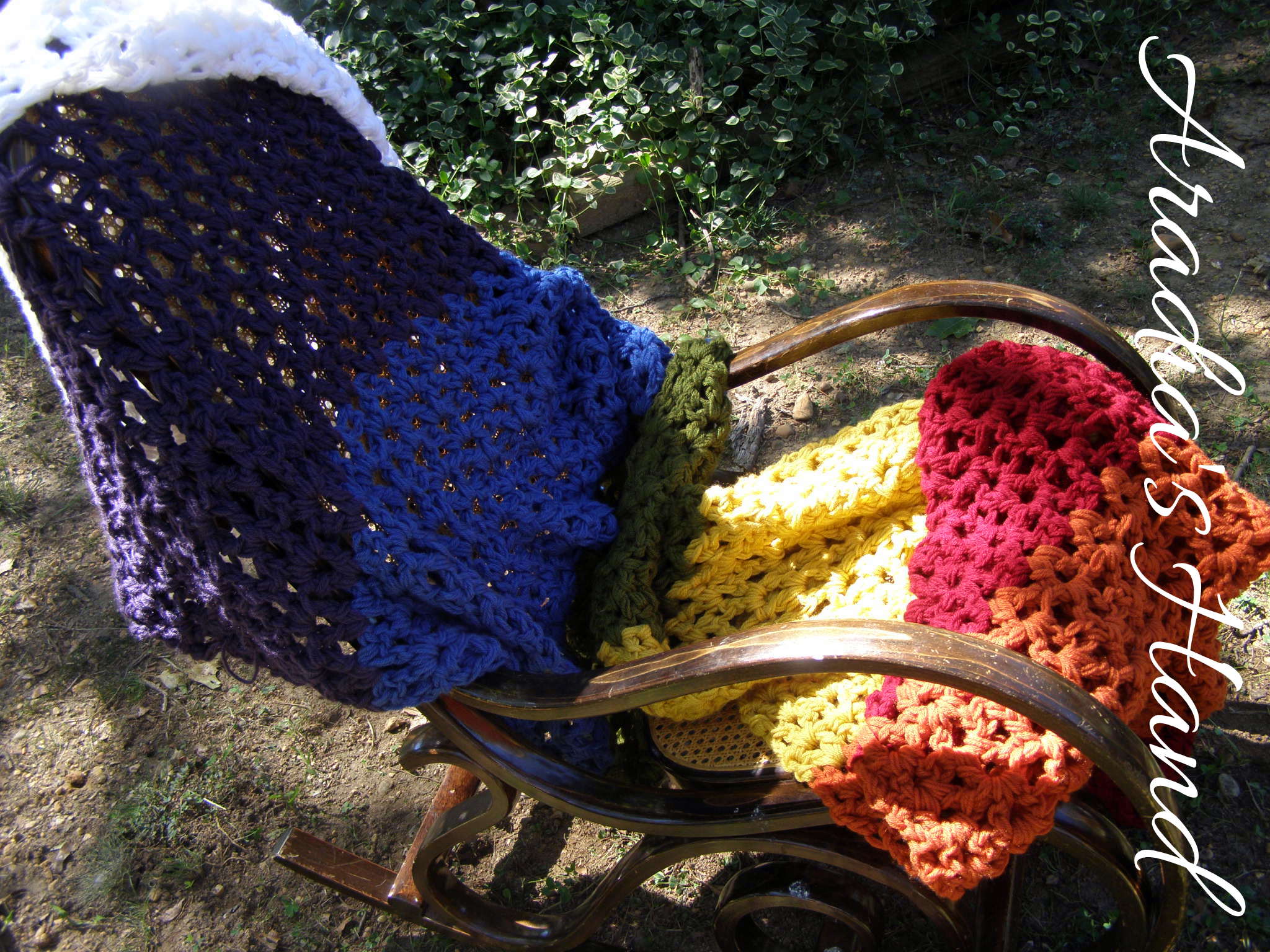 In Hindu thought the chakras are seen as swirling vortices of energy that are formed at the junction of nadis. The seven main are at major junctures and situated along the spine. Each chakra has it’s own name, color, representation, sound, stones, herbs, oils, etc which can be used to clear and activate it. Among the simplest ways to activate the chakras are through color. This lovely multi-colored blanket harnesses the healing colors of each of the seven main chakras. It is ideal for a healer to place in their healing space, on a Reiki or massage table, or draped over a chair or couch. It is made from 21 balls of yarn held triple thick to give it a nice thickness.