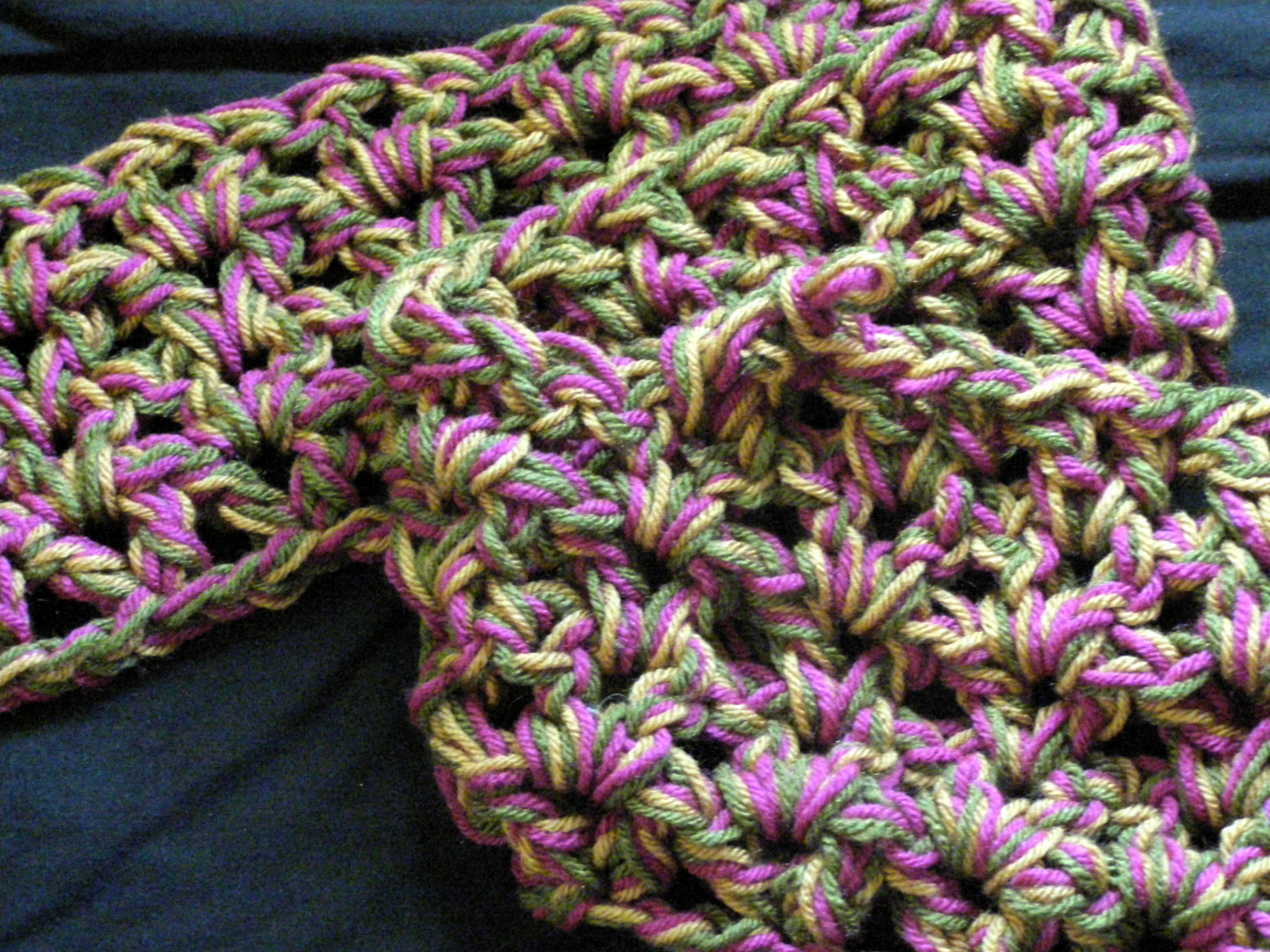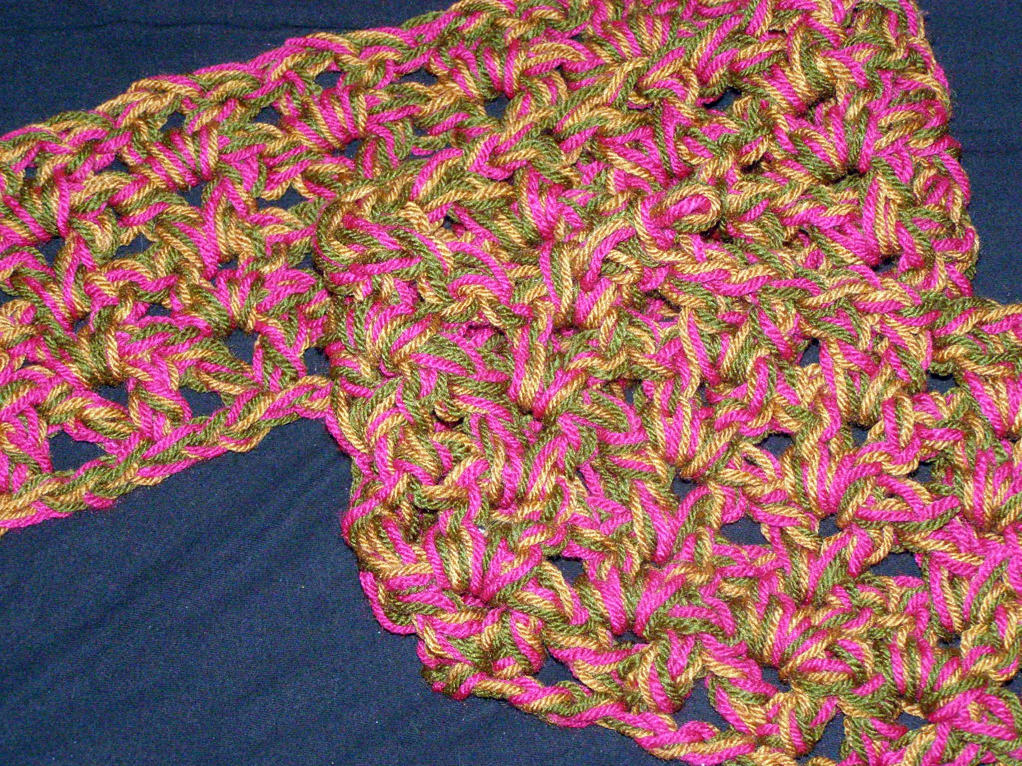 Lovely thick three color scarf to keep you warm. Made in an openworked stitch that creates cozy pockets of air to keep your neck nice and insulated. *Available in custom colors.*