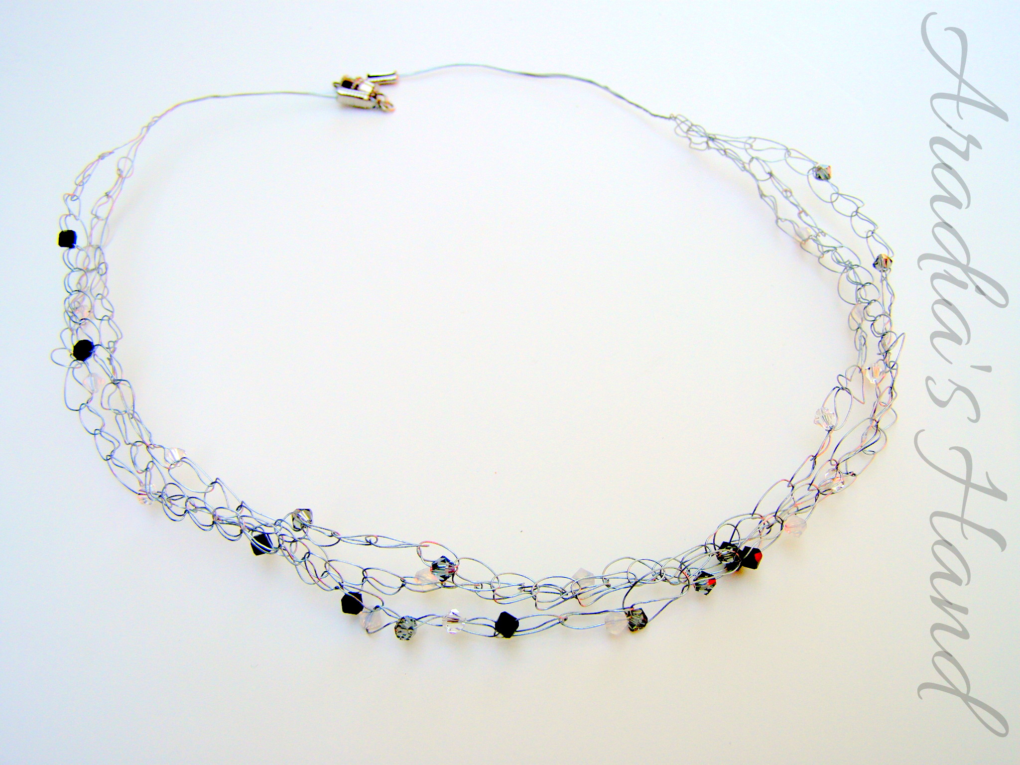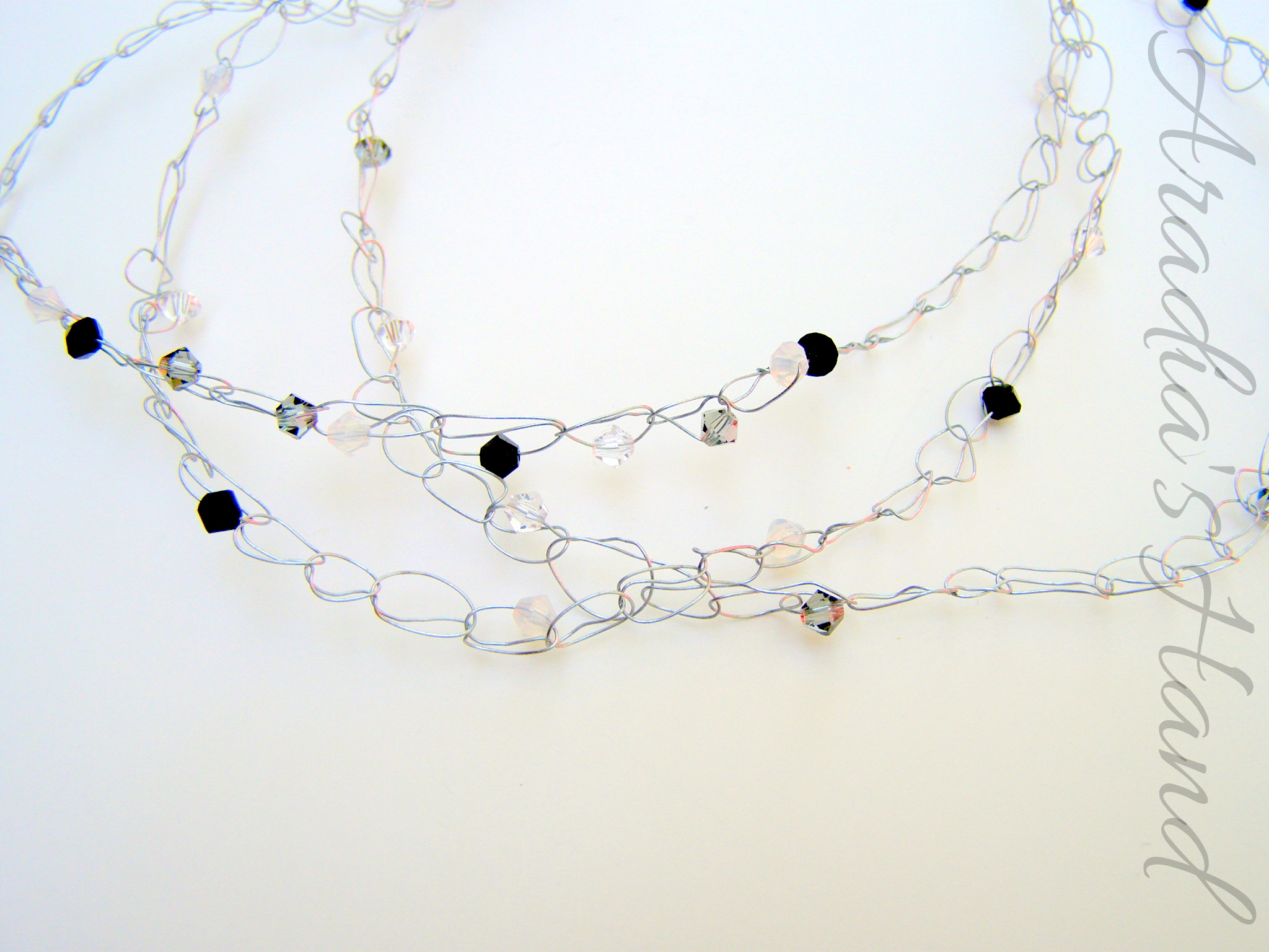 Made with Swarovski crystals, beading wire, and metal findings.