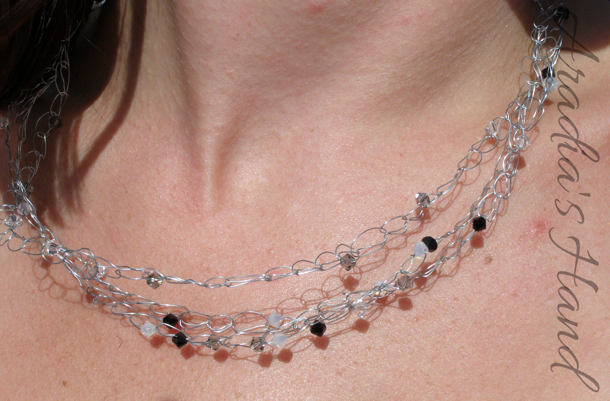 Deck yourself out in some classy jewels to match any ensemble. Crocheted jewelry gives a fun and organic look to this elegant palette. Layered with shades of smoky gray, white, clear, and black this multi-strand Swarovski crystal necklace is the perfect bit of sparkle to your night out.