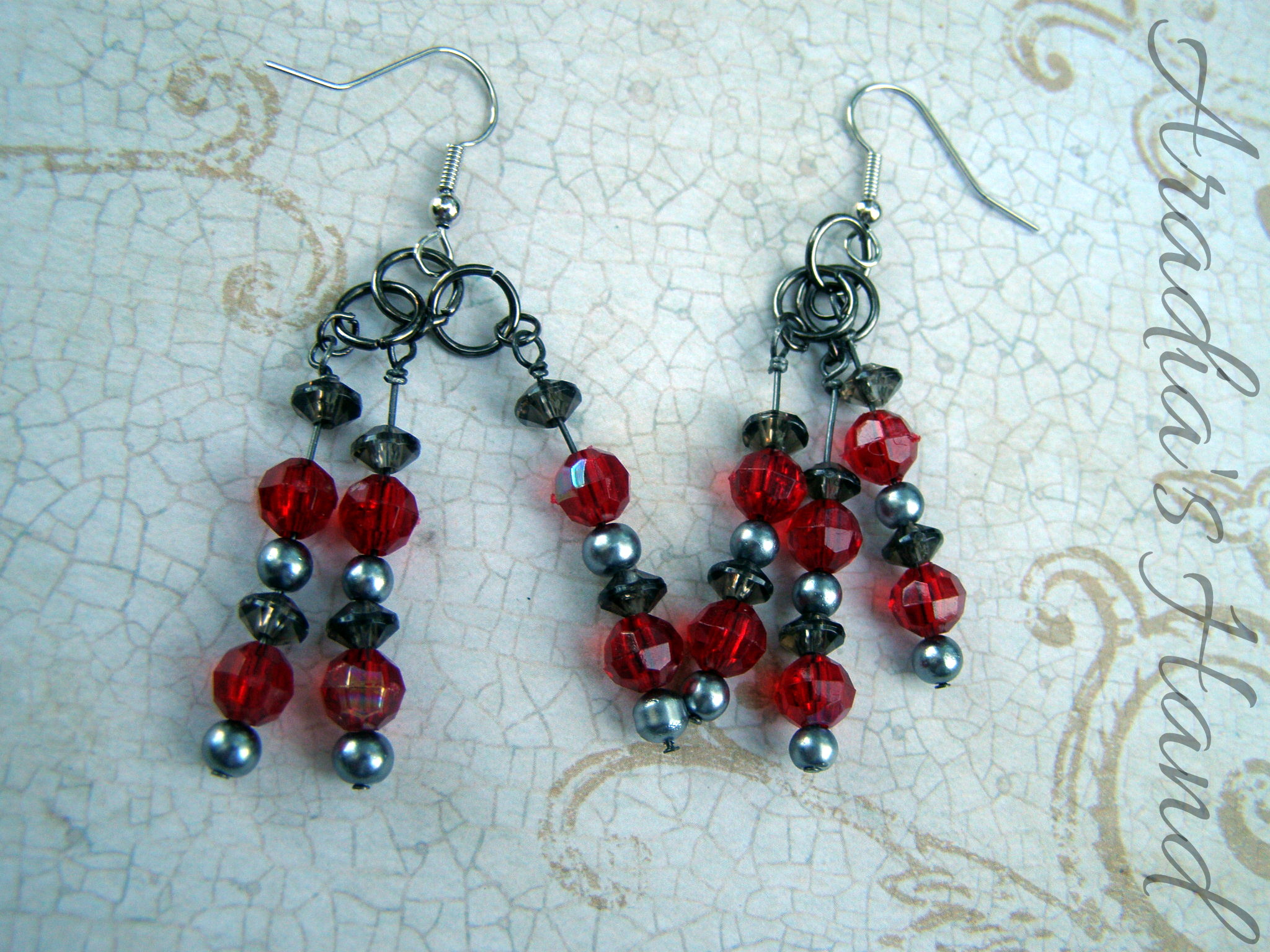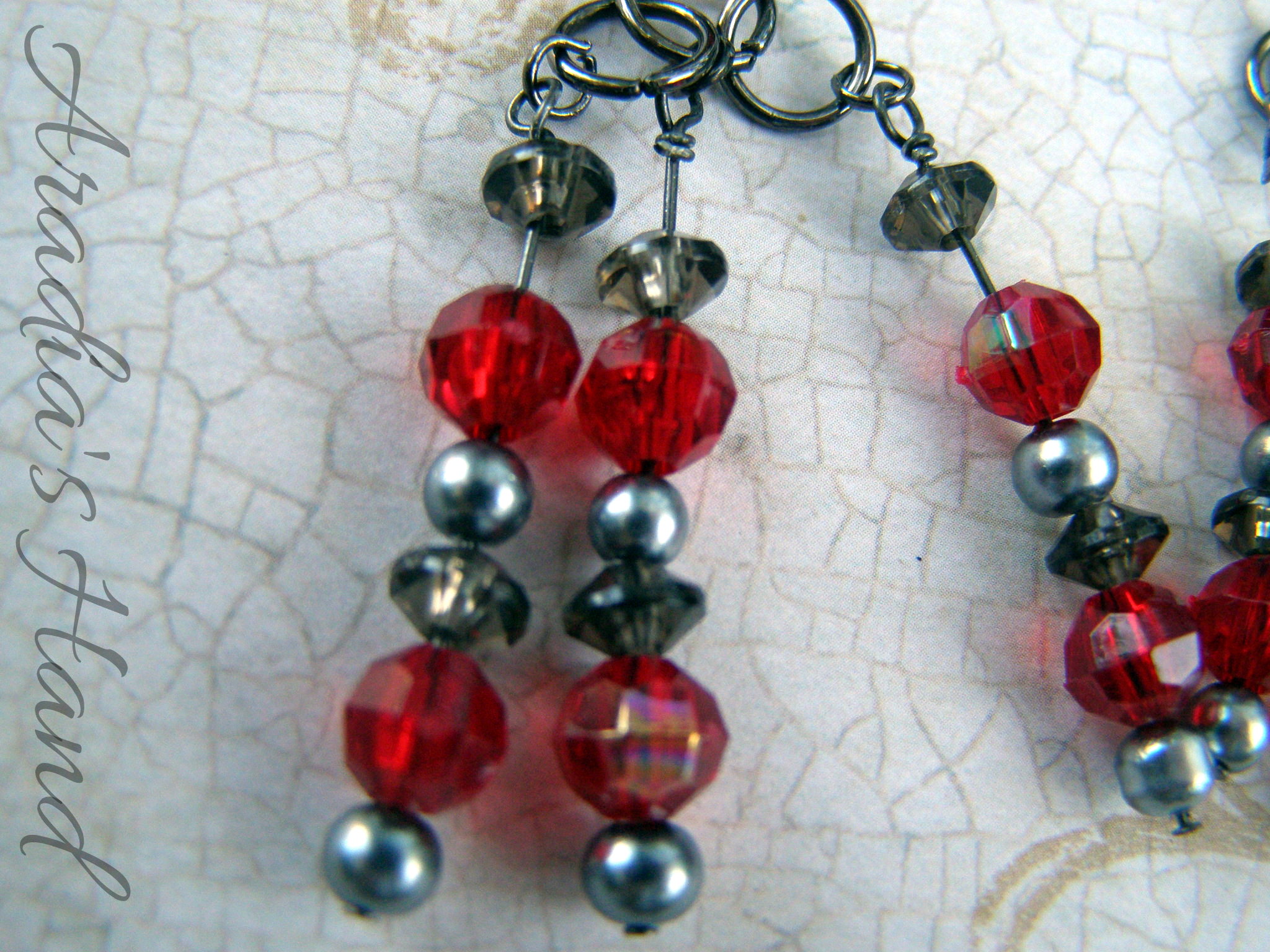 I love the dark beauty of gothic colors that is captured within these dangle earrings. Reminiscent of the style of Edgar Allan Poe's writings it betides a certain somber elegance. I made them with a combination of plastic beads of bright red and a semi-opaque and opaque smoky gray.