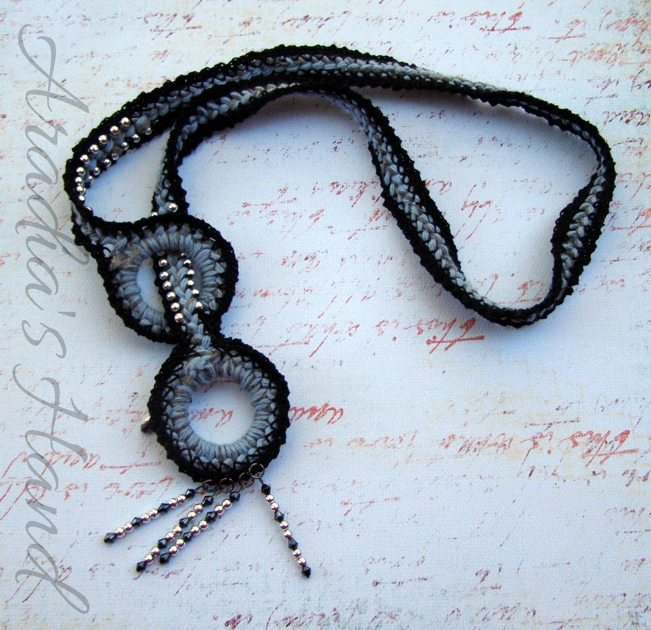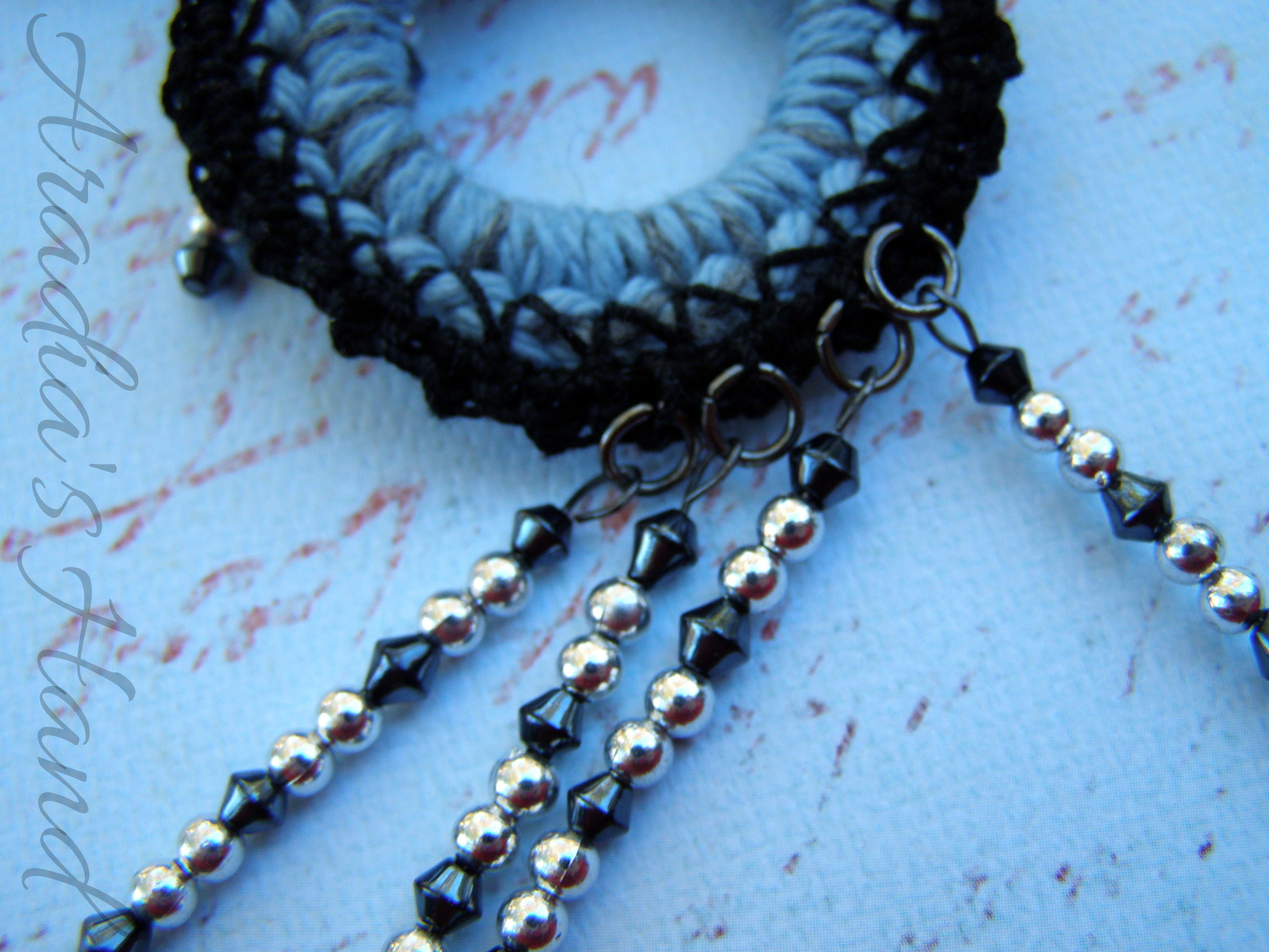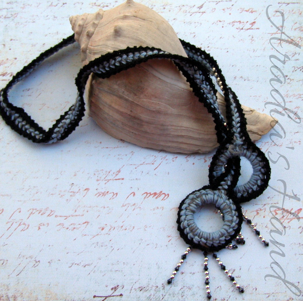 Along stormy seas, crash the bitter waves. Thunder crash and lightning slash the sky...Beaded dangles reminiscent of the flash of lightning in a tempest. Two stiff rings connected by a strand of double stranded crochet. A pale, muted gray worked with a gray form the main color. The necklace is edged in a decorative border in black thread and beaded which round silver beads and hematite colored bicones.